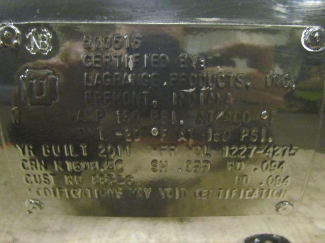 12.2 Gal Steel Air Tank. Black Powder Coat Finish. 12" Dia. X 27" Long. Foot Mount w/Top Brackets. NPT Ports 1/4" Drain, 1-1/2" End, 3/8 + 3/4" Side. MAWP 150 PSI At 400°F. MDMT -20°F At 150 PSI. New + Unused.