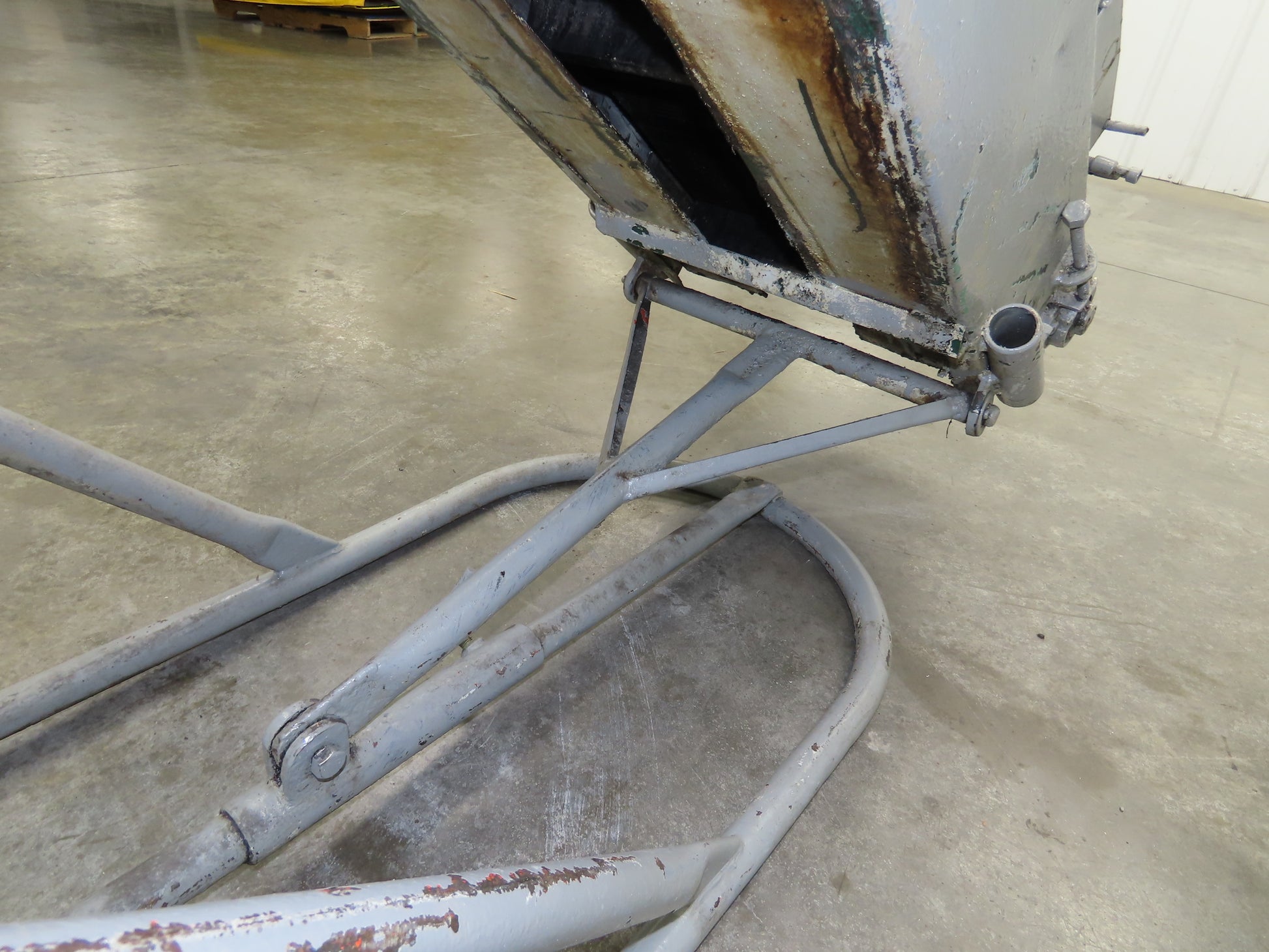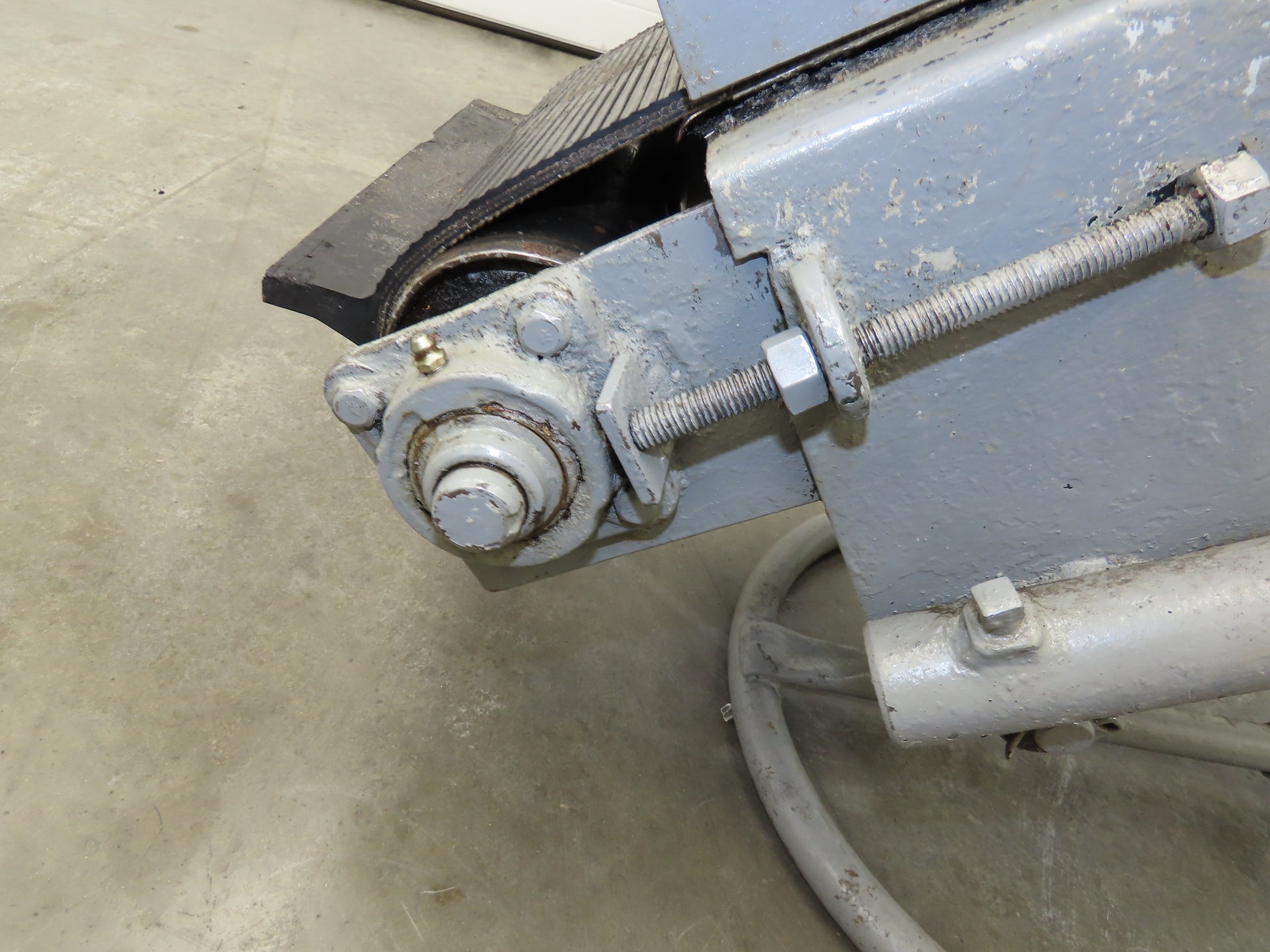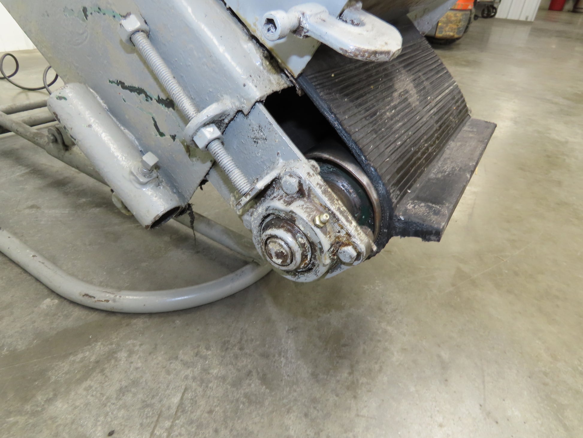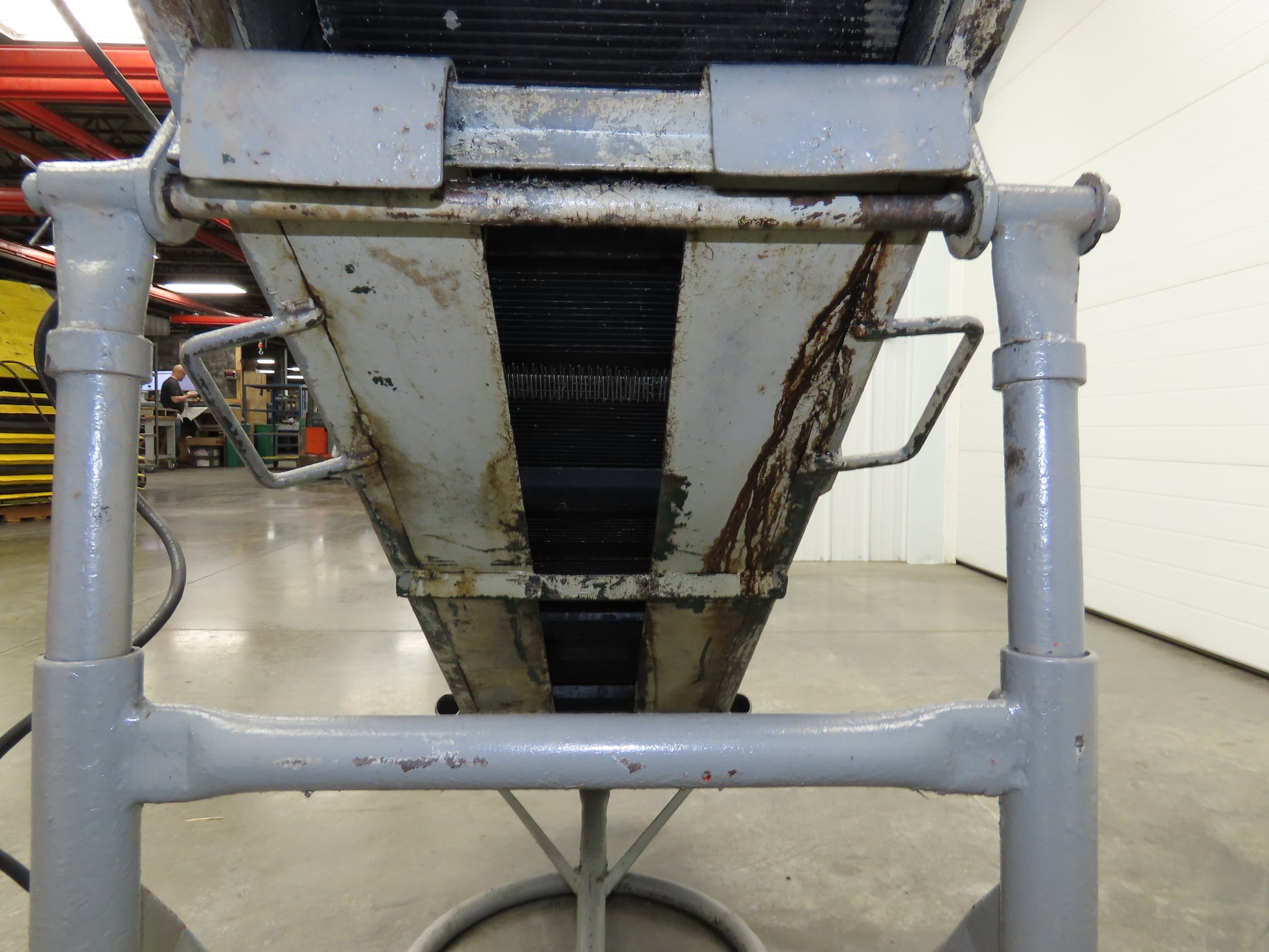 - Adjustable incline conveyor on steel tube frame with steel front wheels. 23" Wheel base width. This is an older conveyor, no tag or info on it. Heavy duty steel construction.