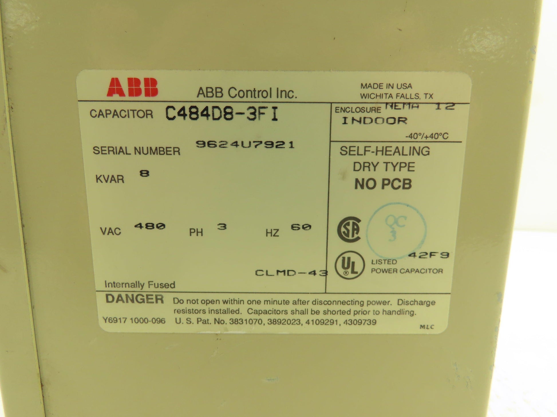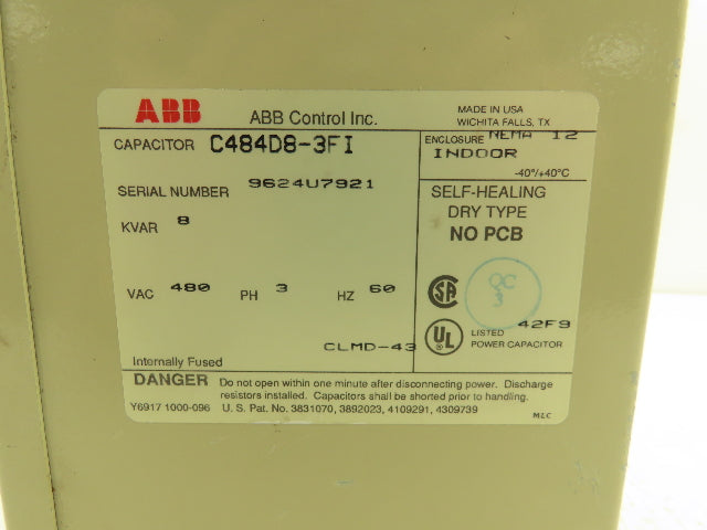 ABB C484D8-3FI Enclosed Indoor Capacitor 8 Kvar 480V 3PH NEMA 12 Dry Type