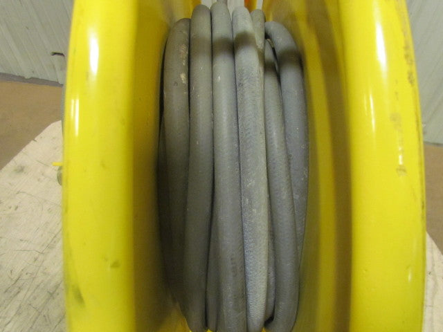 Used hose reel in good clean condition. Tested OK. 70' of 1/2" ID hose. 1" NPT inlet connection. 29" overall height, 27" width. 16" x 12" mount base.