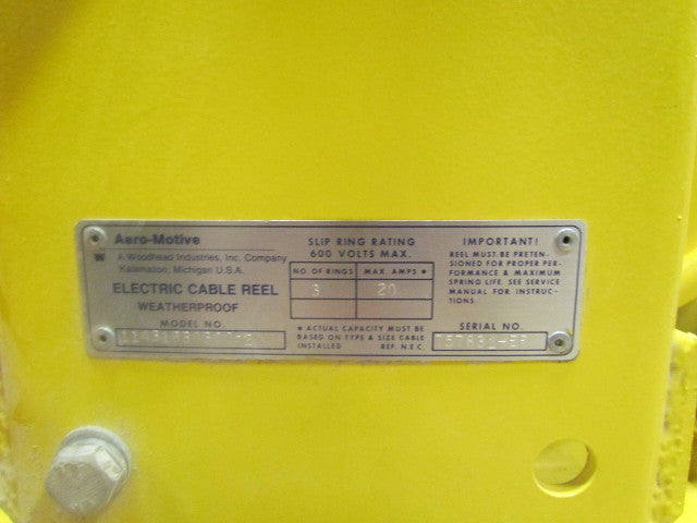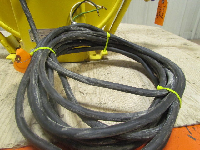 Used cable reel in good working condition. 45' of 12/3 wired for 110V. 30' of 14/3 conductor hookup lead cable. 24" overall height, 16" width. 14-1/2" x 7-1/2" mounting base. Heavy-Duty Steel construction. (Weatherproof.).