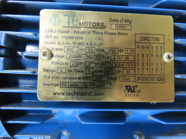 - Motor is 3/4 hp, 1725 rpm, 230/460 volt 3 ph.