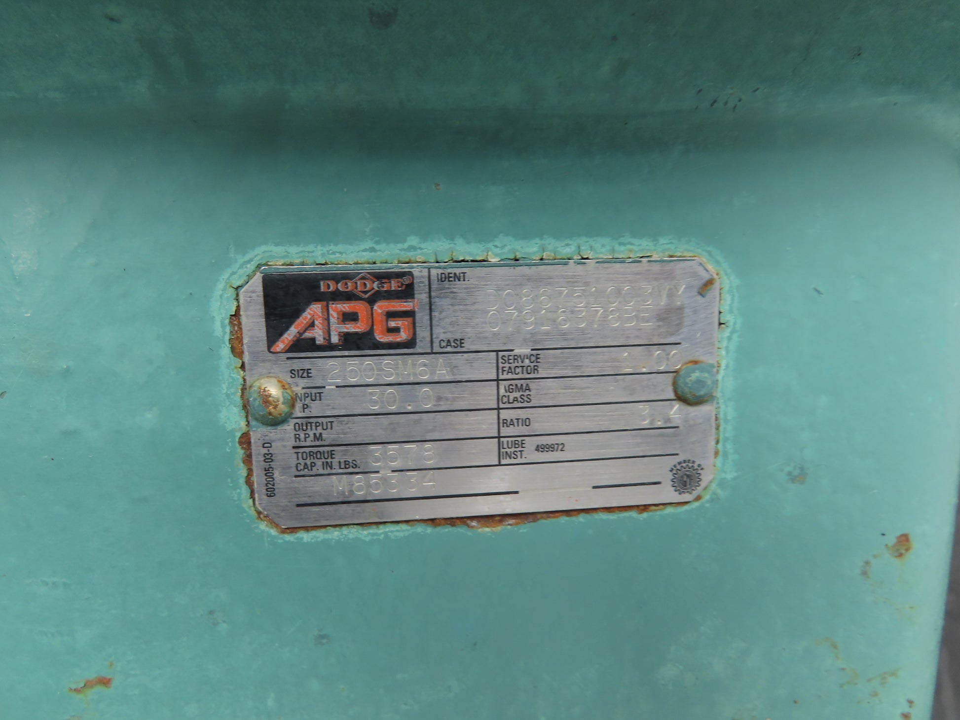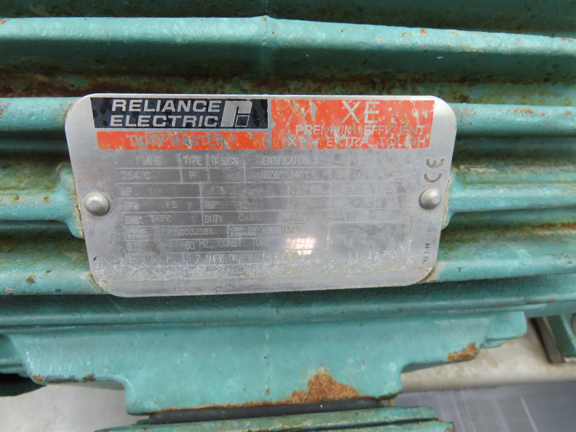 - Motor Specs: 15Hp 1760 RPM 460V 3PH 254TC Reliance XE 3.4 Ratio Reducer