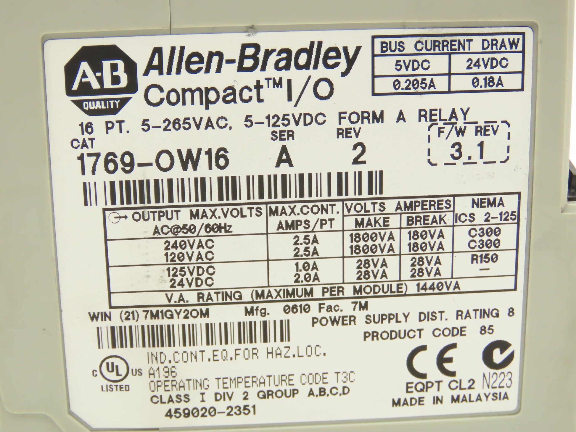 Allen Bradley 1769-OW16 Compact 16-Point Relay Output Module Series A Rev 2