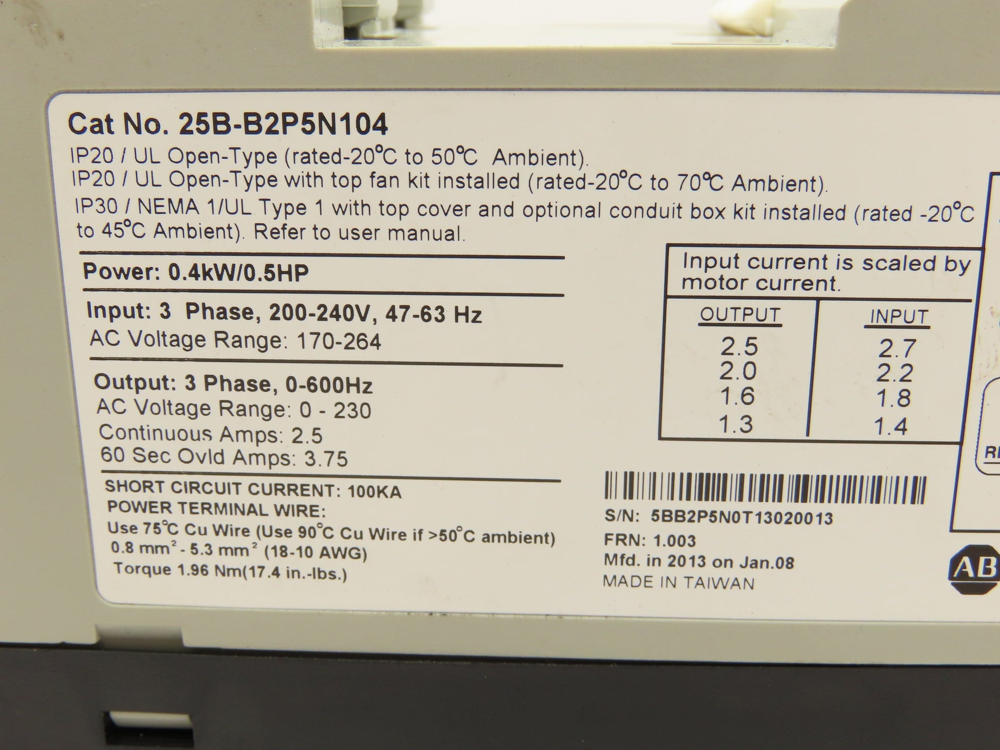 Allen Bradley 22A-A2P3N104 PowerFlex 4 AC Drive Variable VFD .5Hp 230V 1PH Input