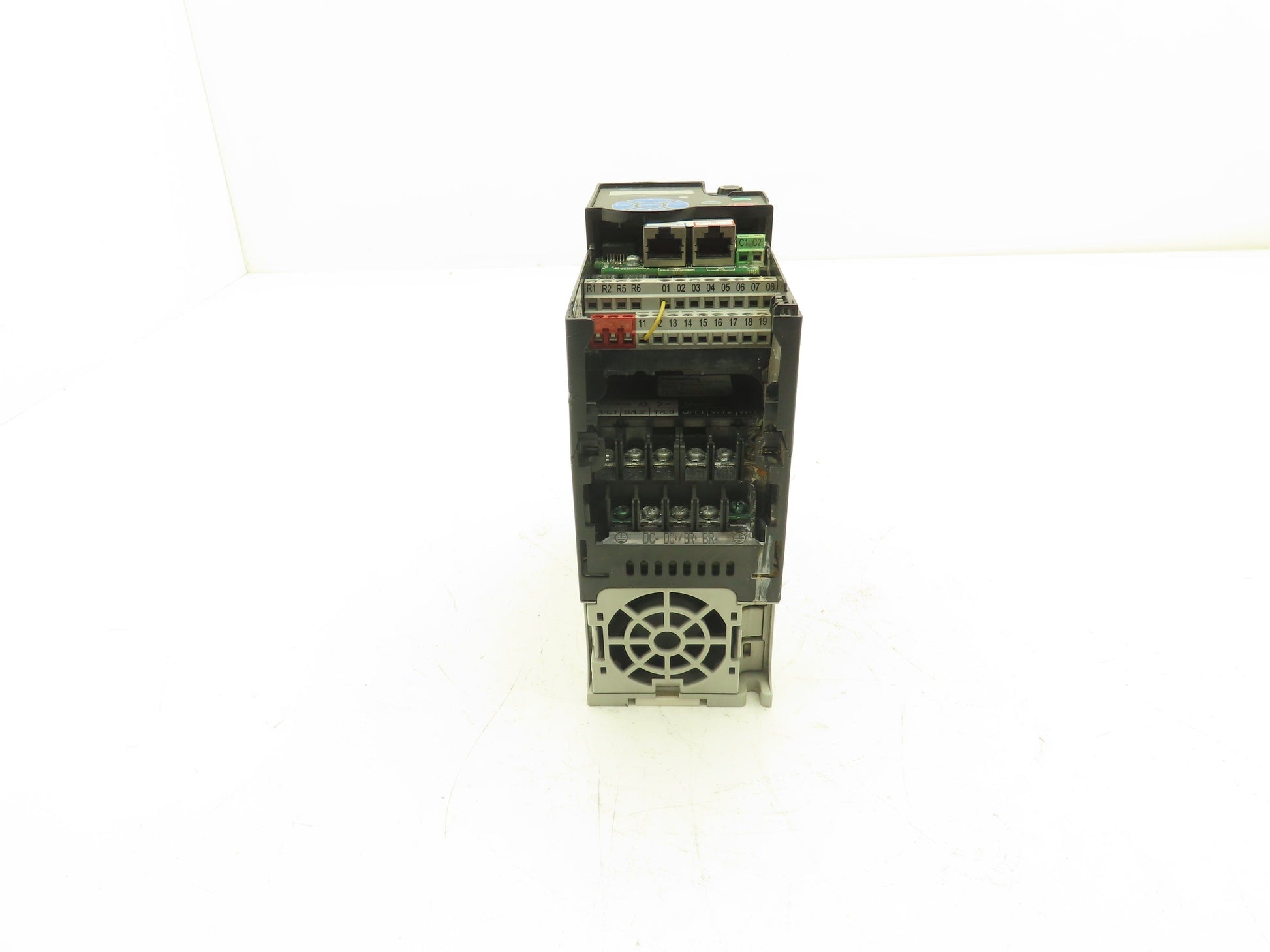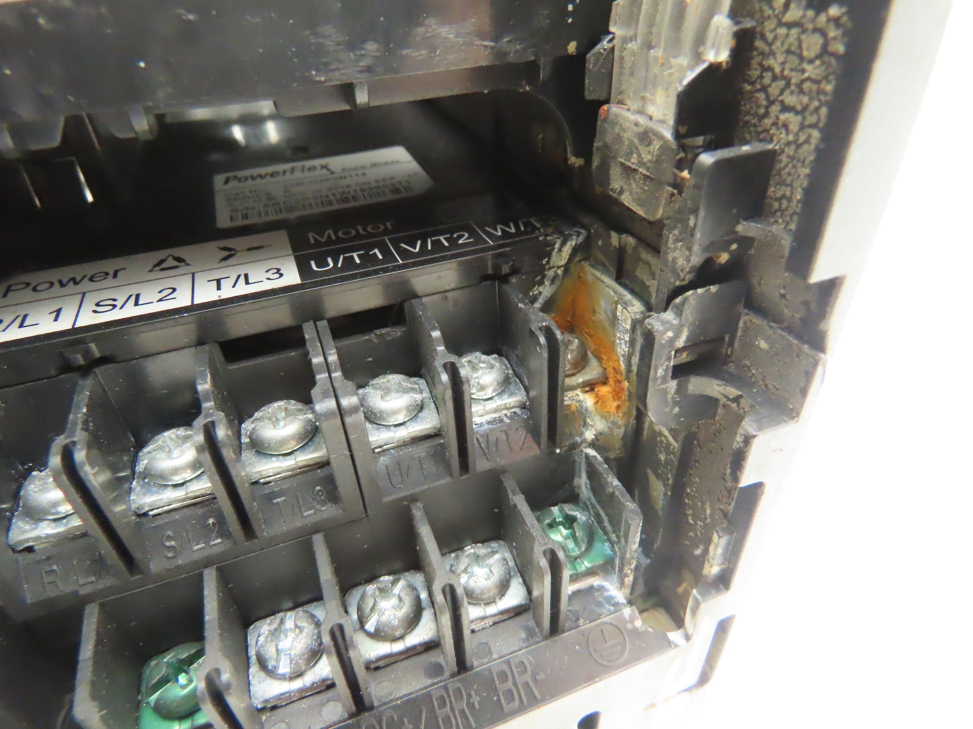 - Front cover is missing. One of the terminals is corroded.