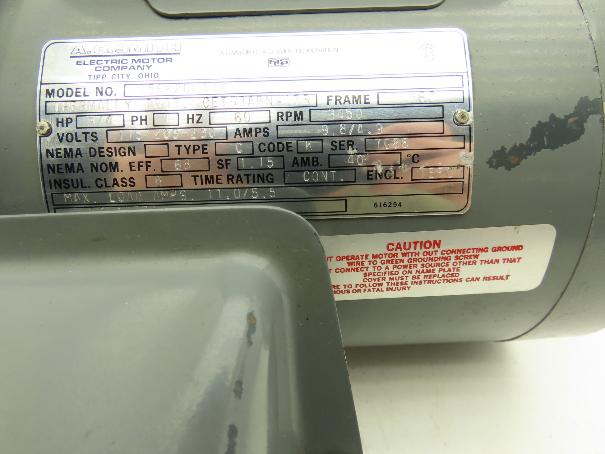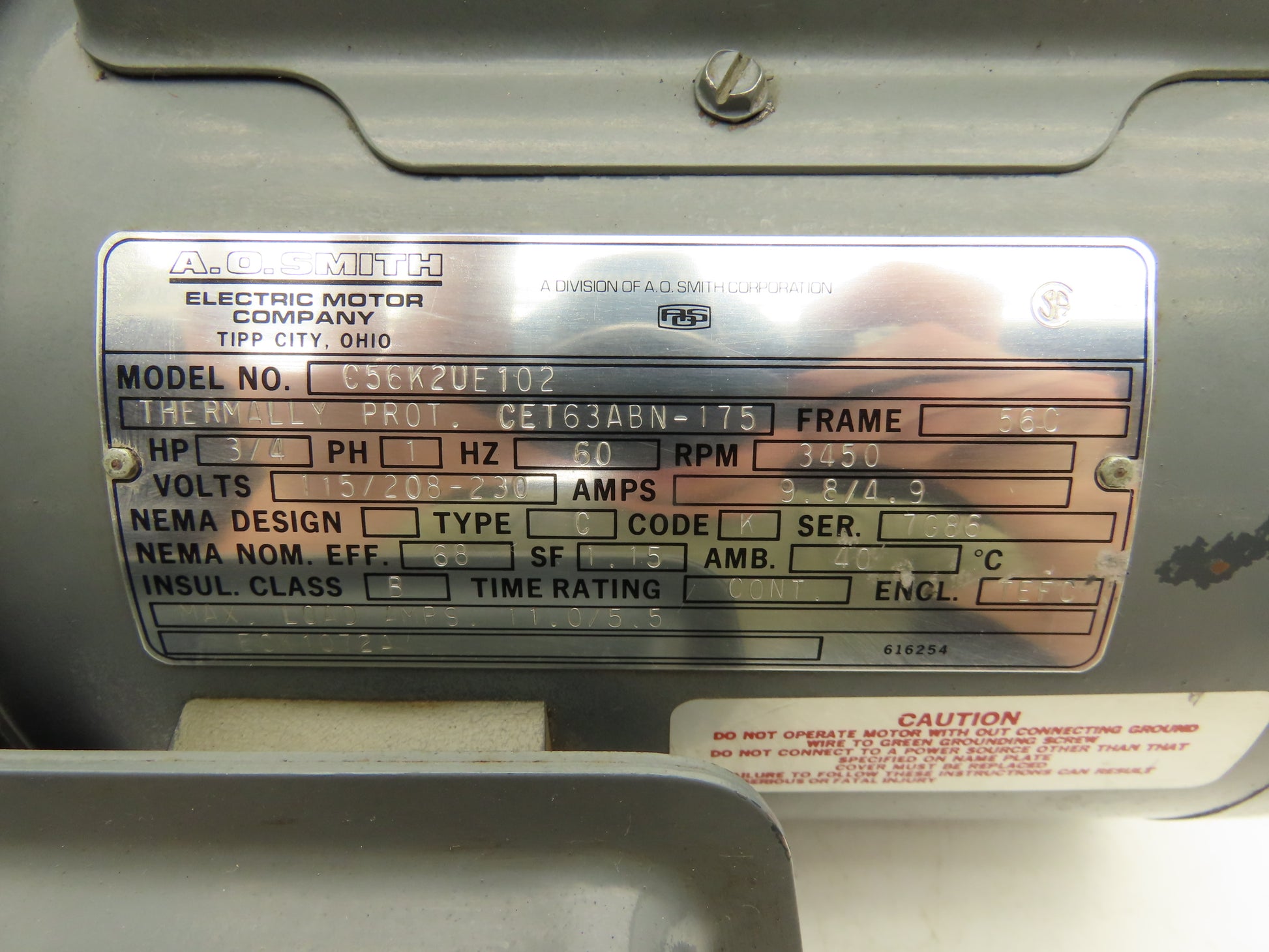 AO Smith C56K2UE102 Single Phase AC Motor 3/4Hp 3450 RPM 115/208-230V 1PH 56C