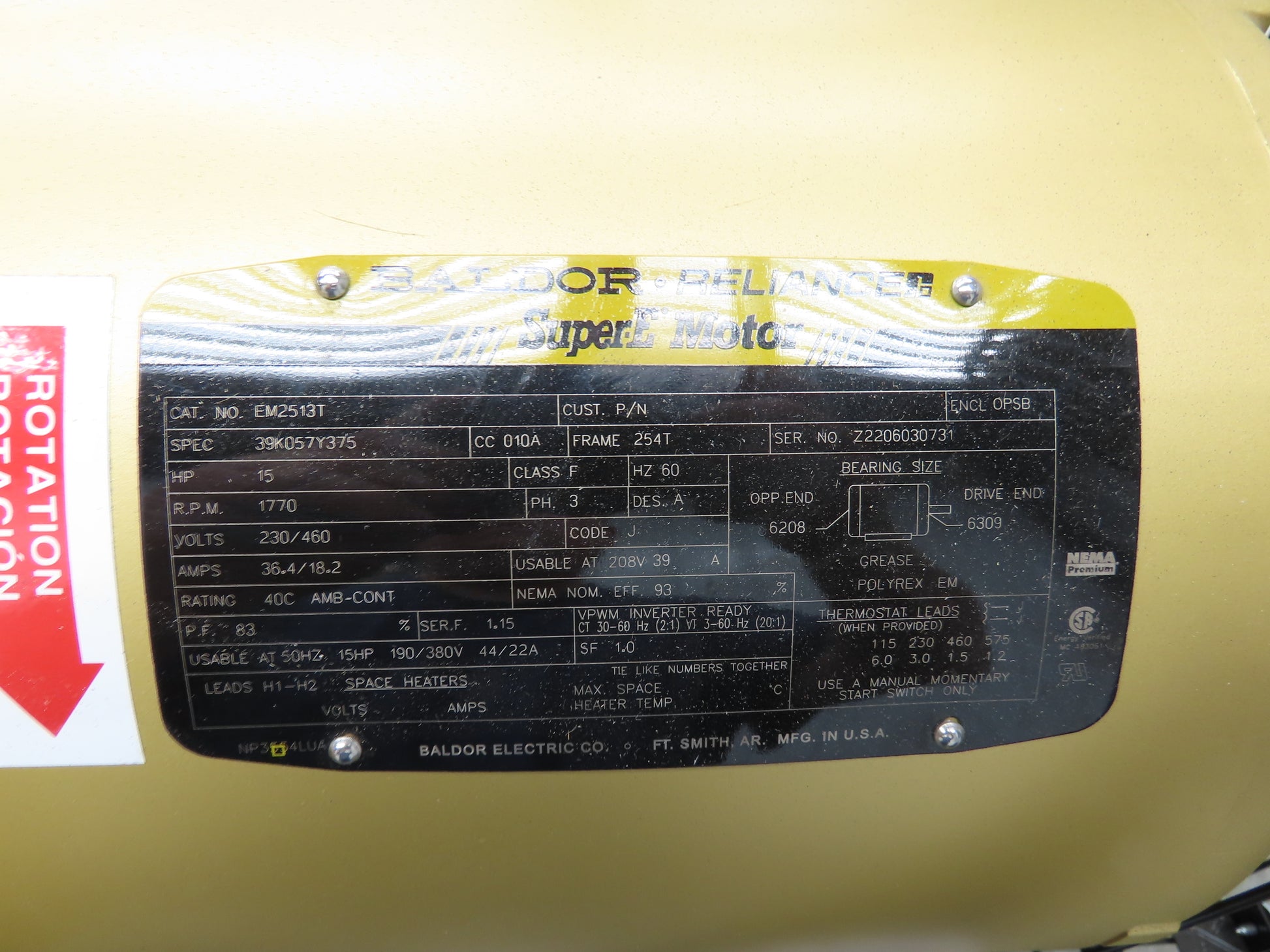 - 15 hp motor 3 phase 230/460V Wired for 460V