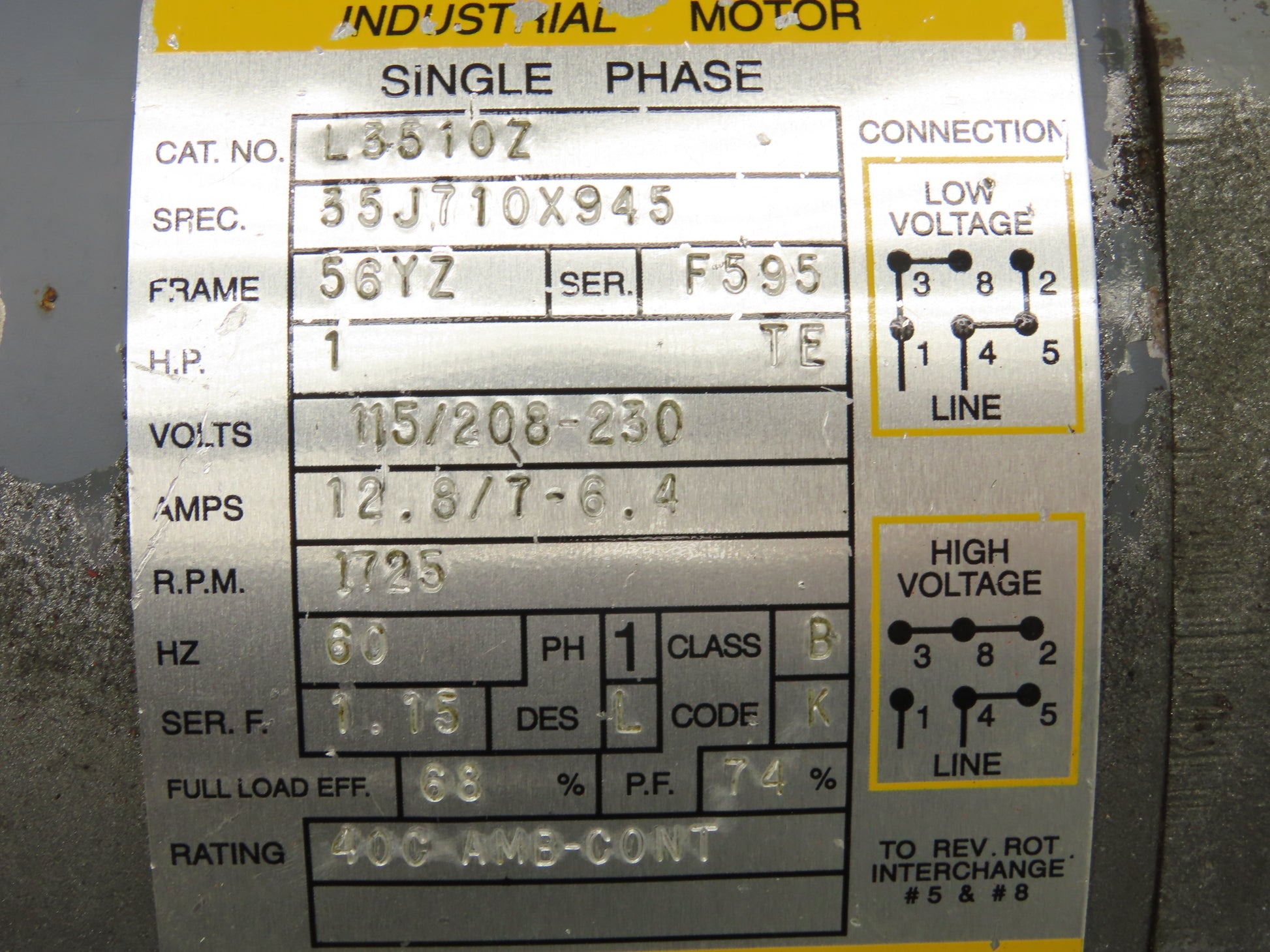 Baldor L3510Z Pump Motor 1Hp 1725rpm 115/208-230V 1PH 56YZ Slot Shaft