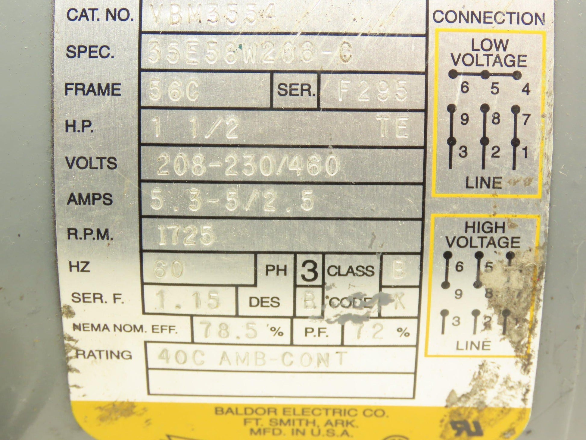 Baldor VBM3554 Brake Motor 1.5Hp 1725rpm 230/460V 3PH 56C **Brake Removed**
