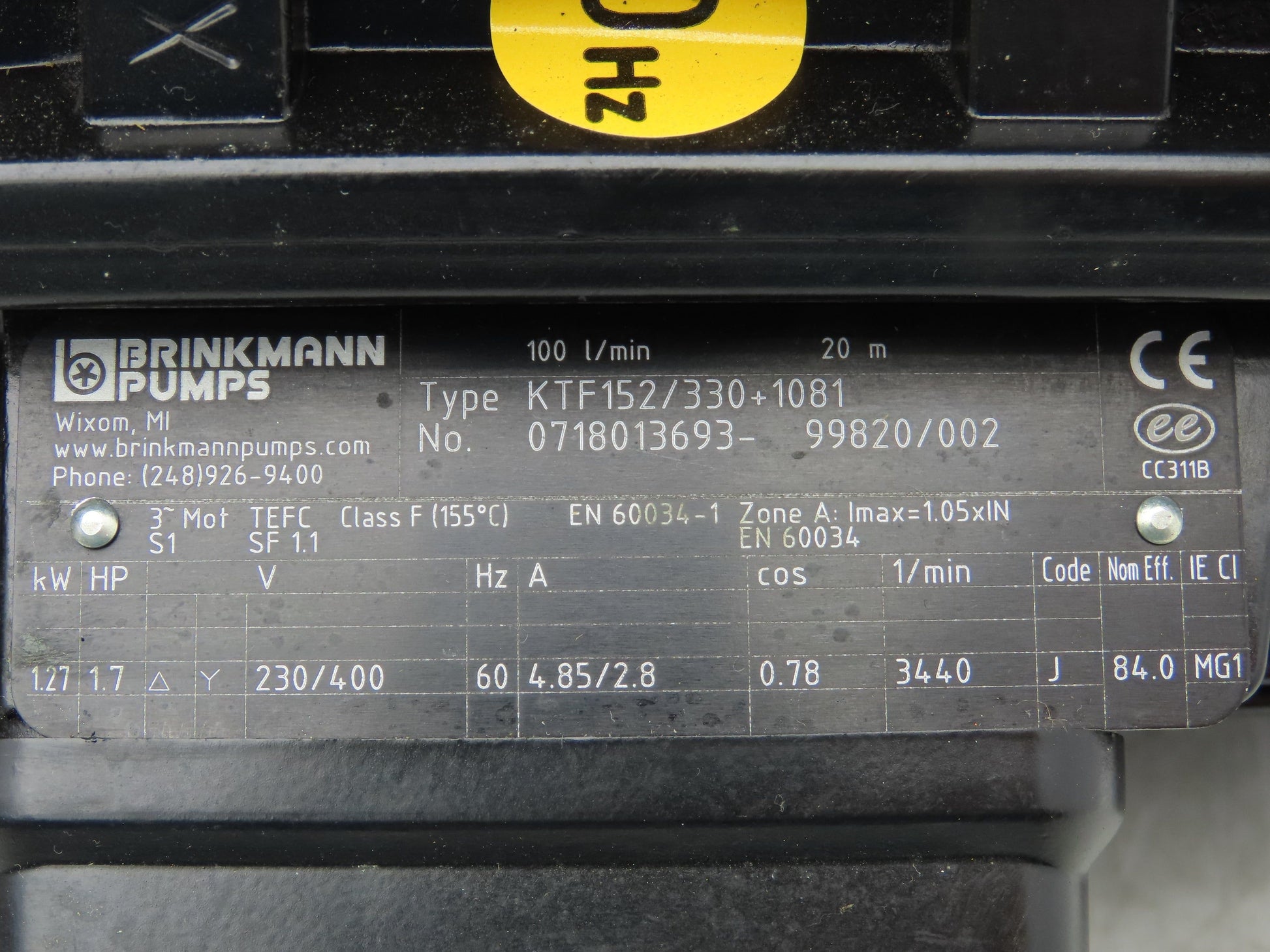 Brinkmann KTF152/330+1081 Plastic Chemical Immersion Pump 35gpm 1.7Hp 230V 3PH