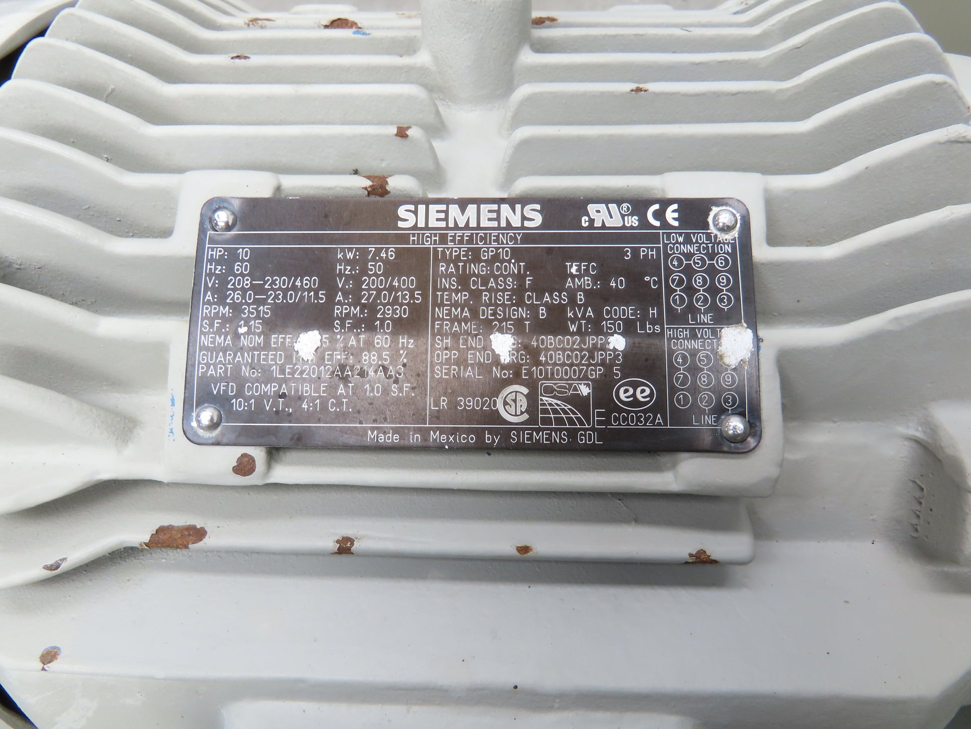 - 230/460V, 3-Phase, 10Hp Motor. Wired for 460V