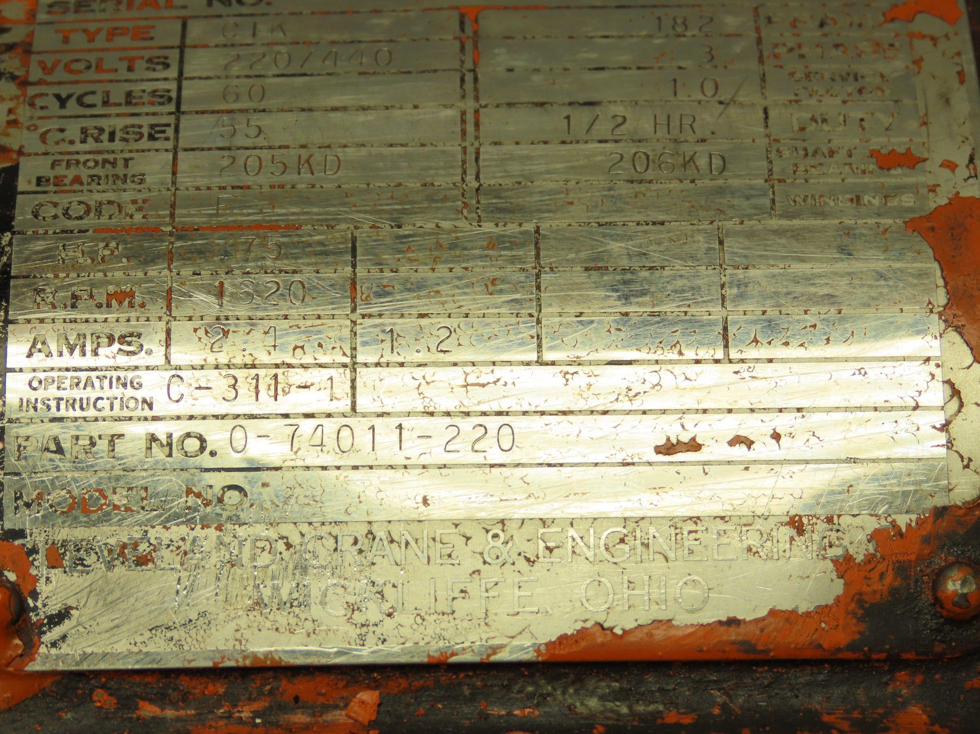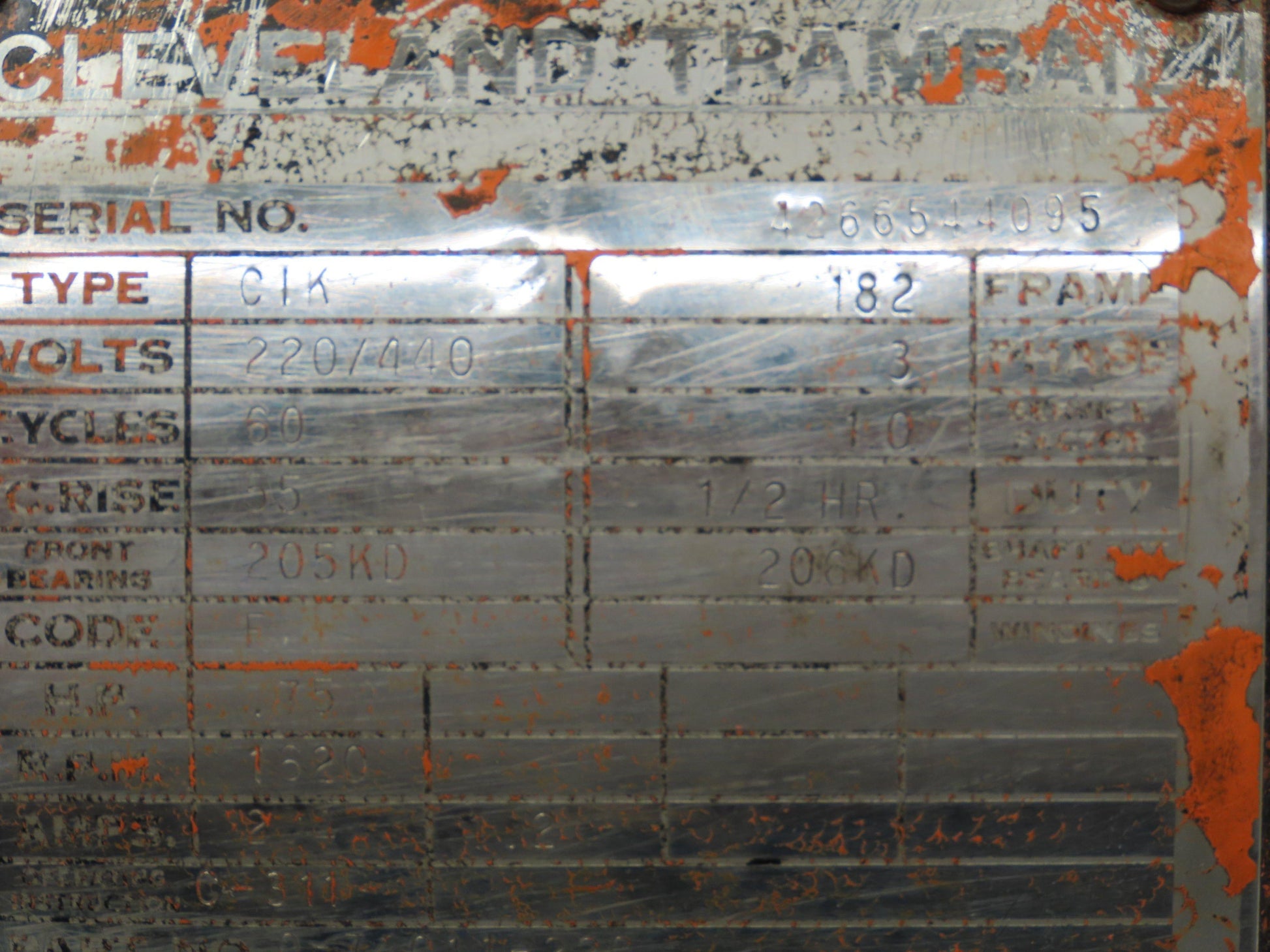 Cleveland Tramrail CIK Squirrel Cage Crane Motor 3/4Hp 1620 RPM 220/440V 3PH 182