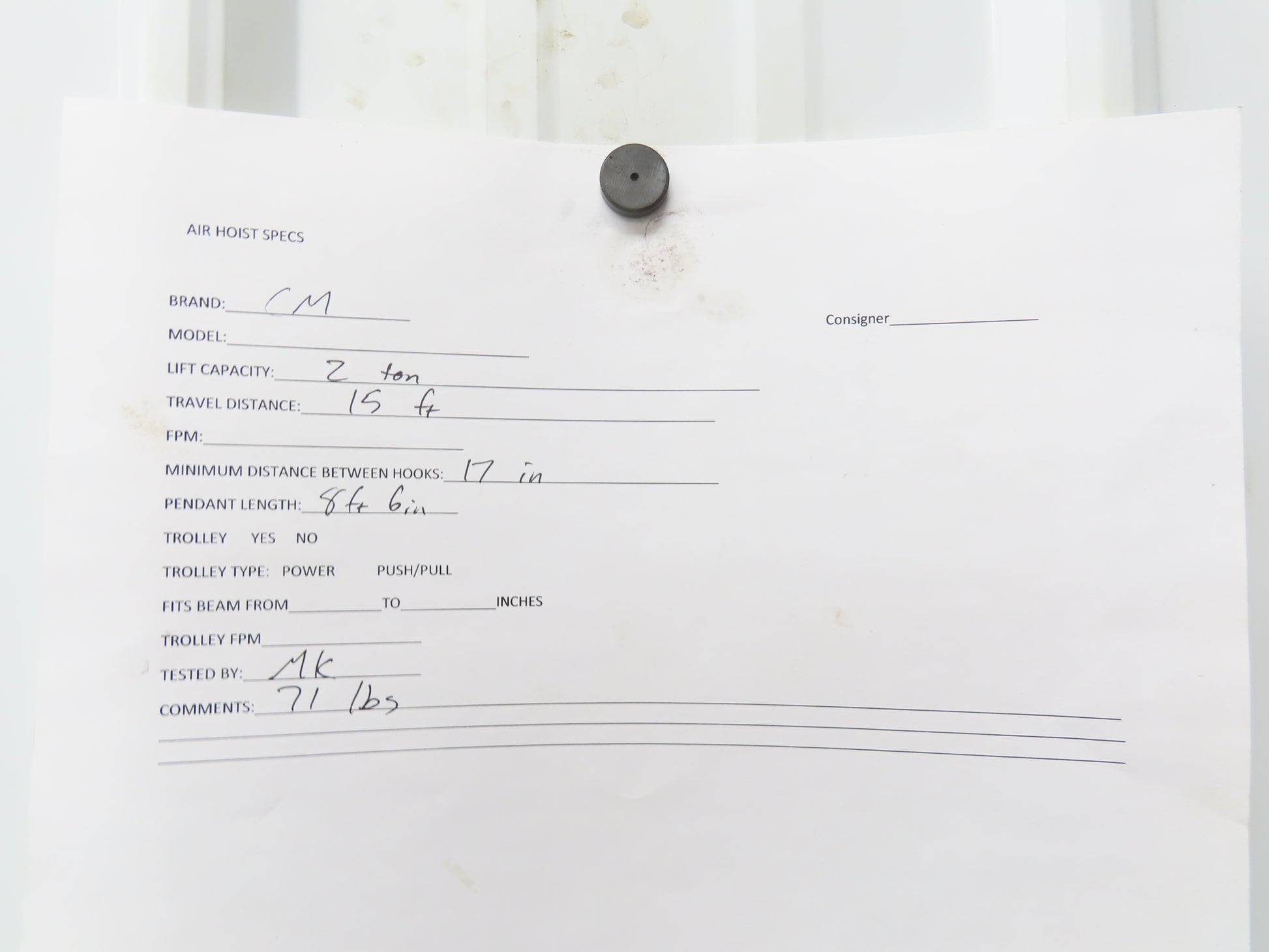 - Pendant/Control Length From Bottom of Hoist: 8' 6" Pull chain length