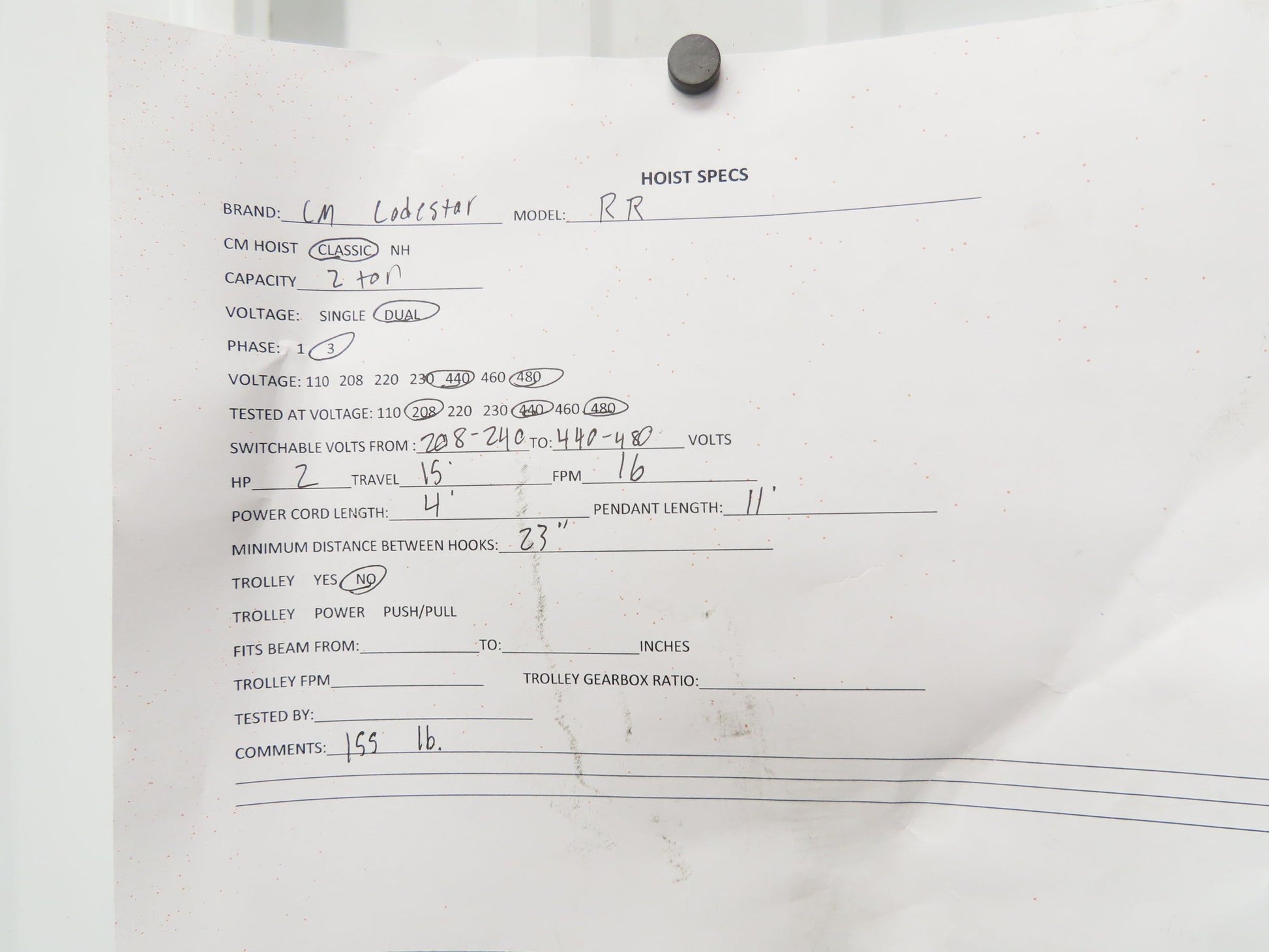 CM Lodestar RR 2 Ton Electric Chain Hoist 15' Lift 16 FPM 230/460 3PH 11'Pendant