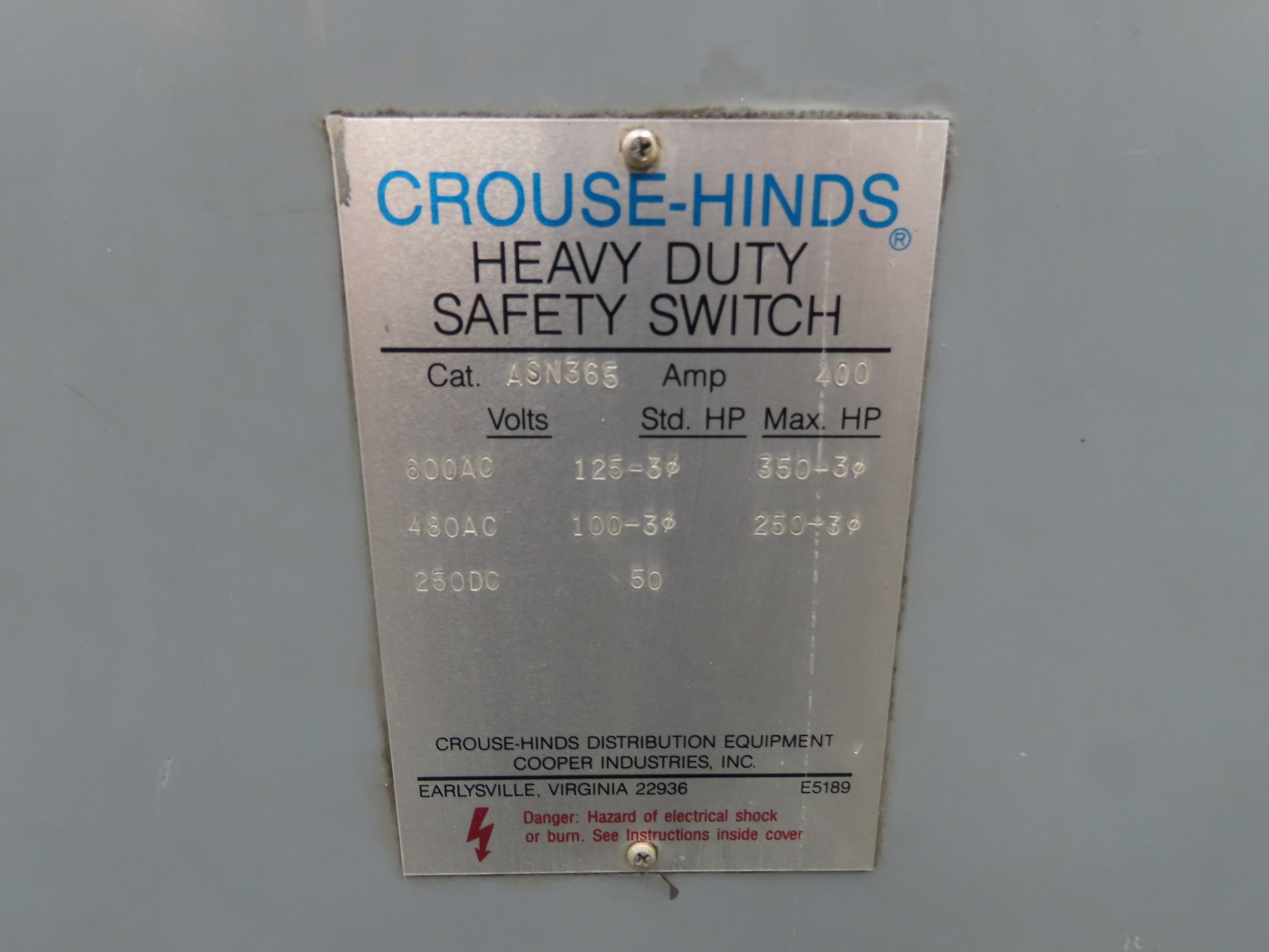 Crouse Hinds Co ASN365 Heavy Duty Safety Disconnect Switch 400A 600V Fused 250HP