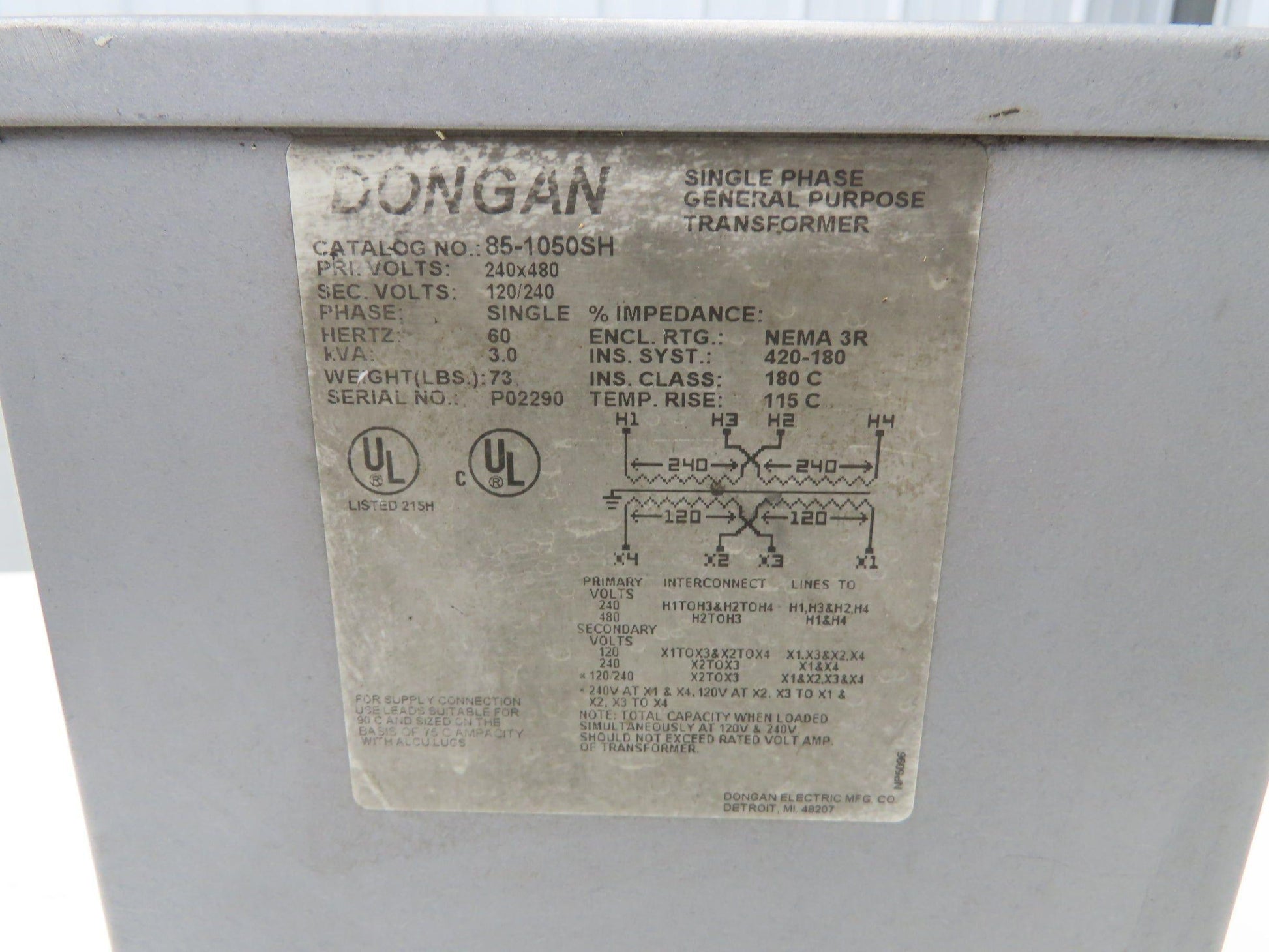 Dongan 85-1050SH Transformer 3KVA 1PH 240v/480v Pri 120v/240v Sec Wall Mount