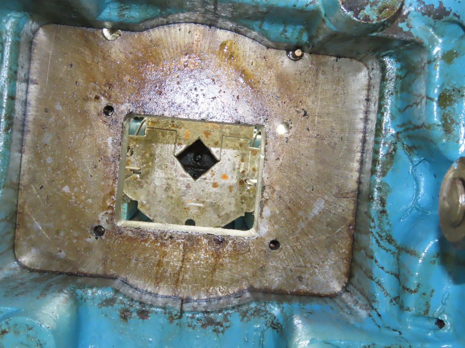 - Has aftermarket plate 1-5/8" thick with T slot. Center hole is 4-5/8"x3-5/8".