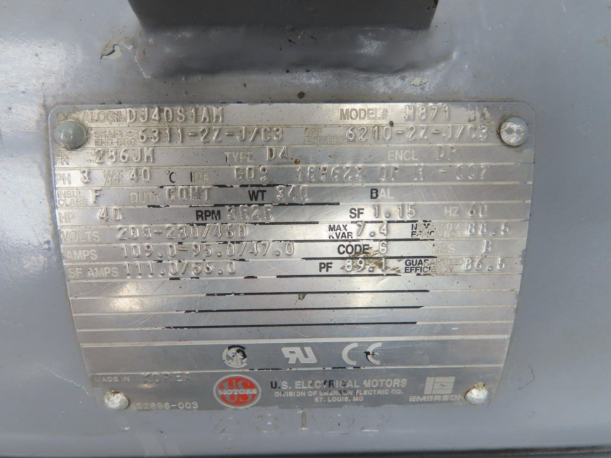 Emerson Electric DJ40S1AM AC Pump Motor 40Hp 3525 RPM 230/460V 3Ph 286JM