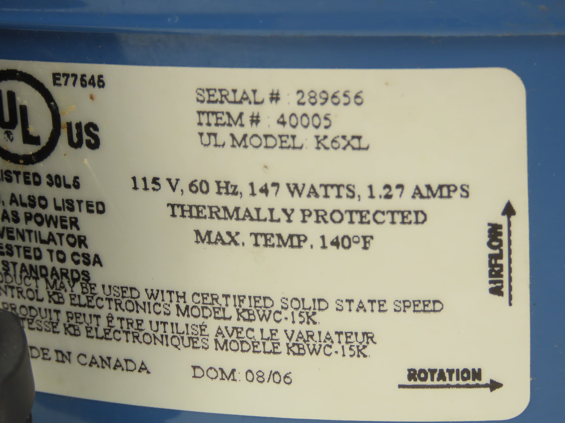 Fantech FX6XL Inline Exhaust Fan 6" Duct Blower 115V Ebm Papst R2E220-AB08-12
