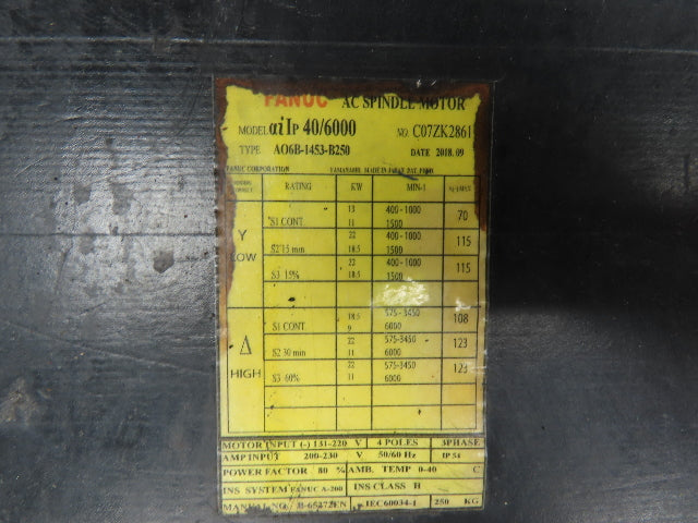 Fanuc A06B-1453-B250 AC Spindle Motor 22kW 6000rpm 131-220v 3ph