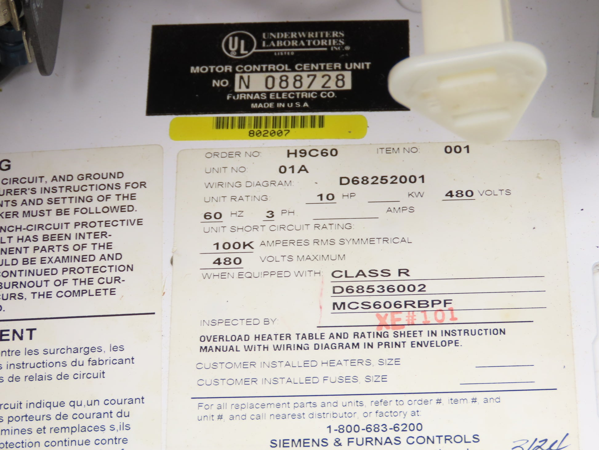 Furnas H9C60 Combination Motor Starter Bucket 10Hp 480V 3ph Size 1 D68252001