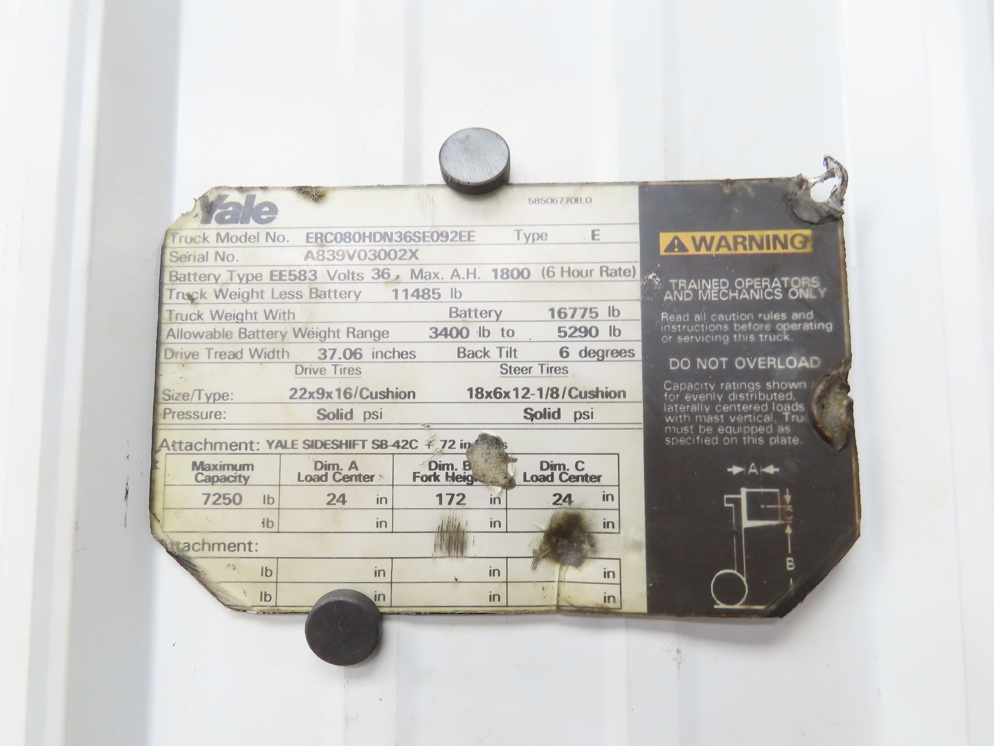 - Removed from Yale ERC080HDN36SE092EE forklift.