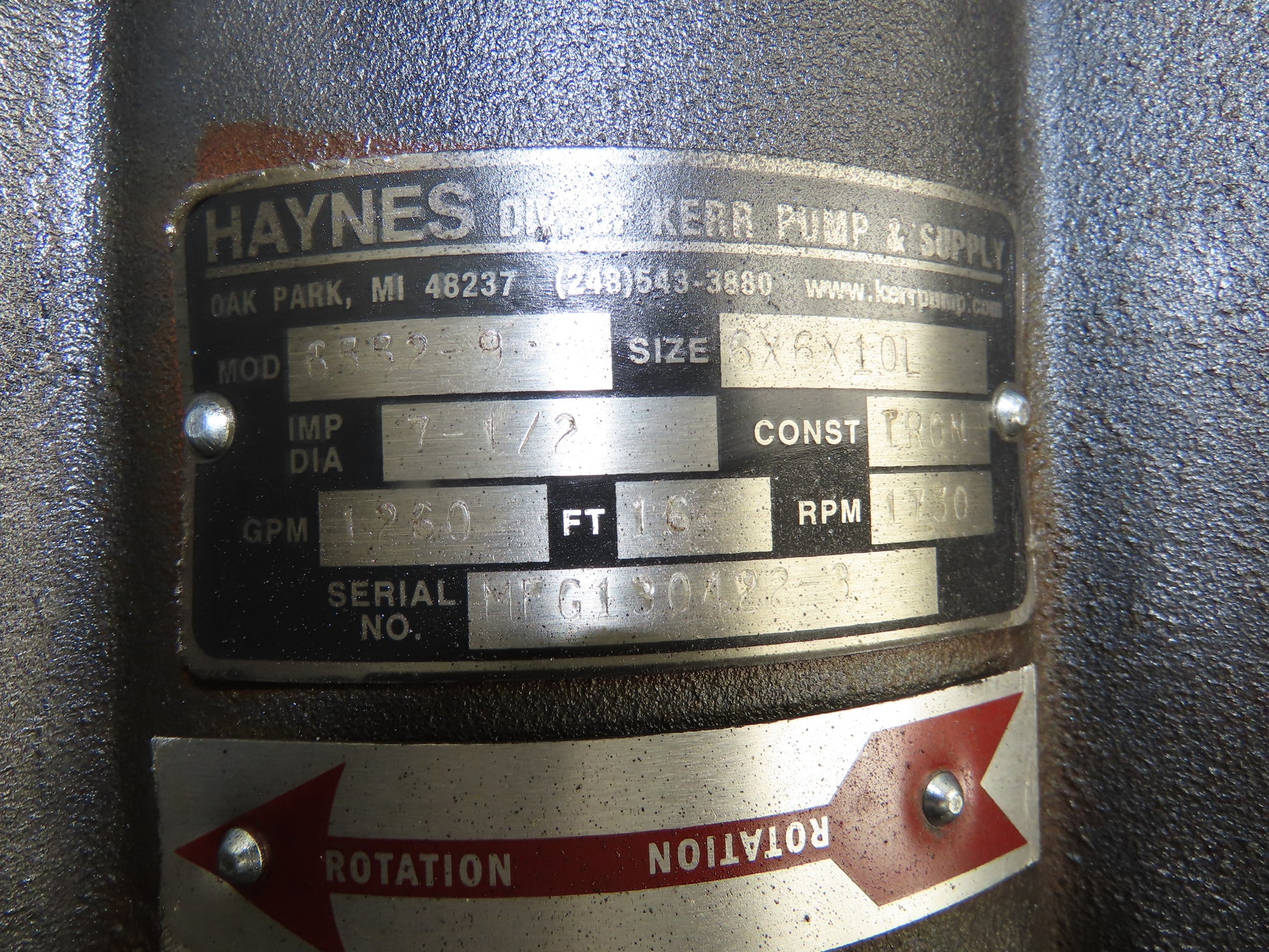 Haynes 6552-9 Vertical Centrifugal Pump 6x6" Flanged 1260gpm 10Hp Motor 230/460V