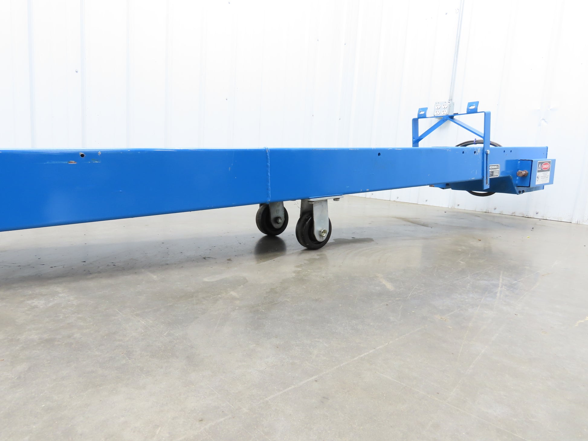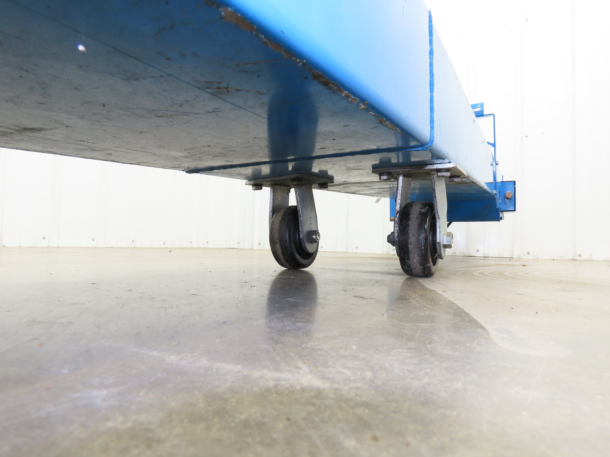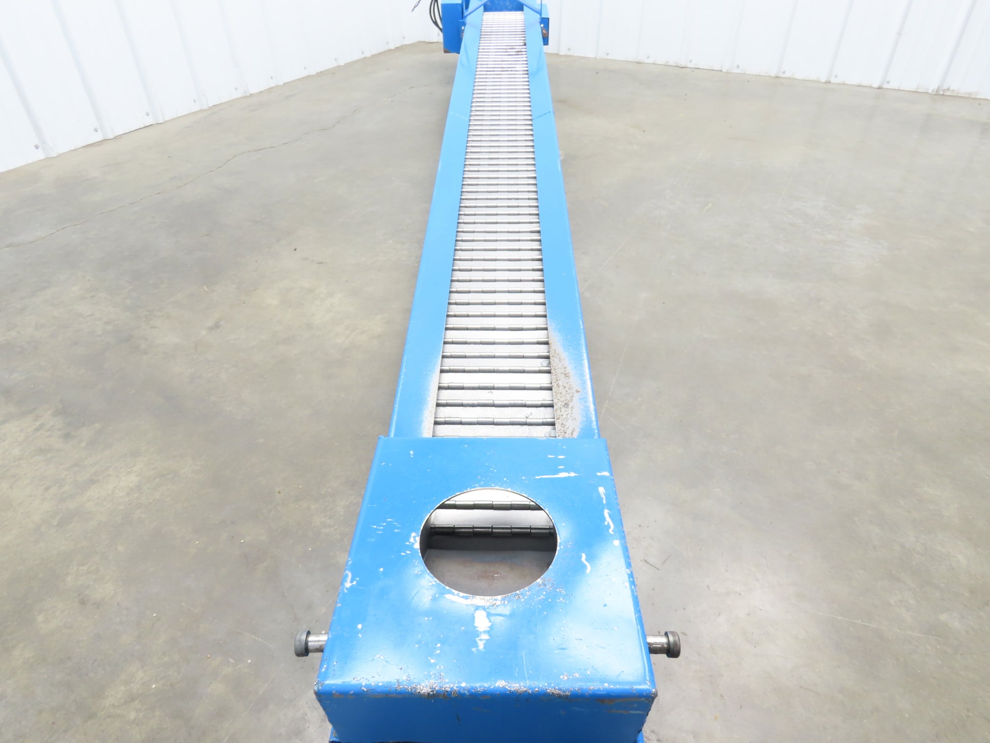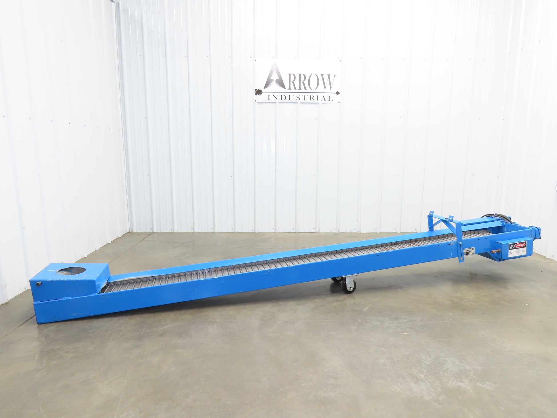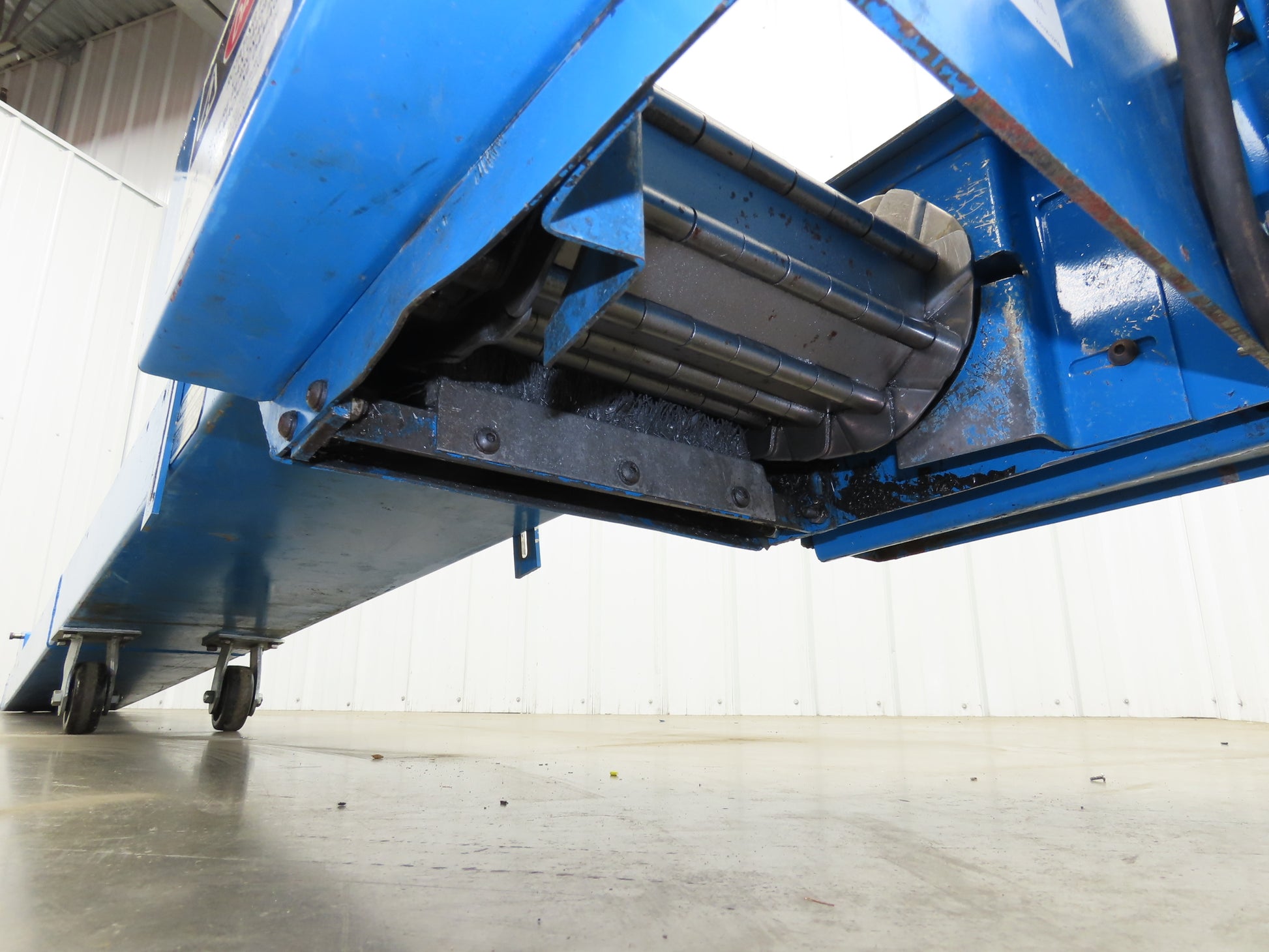- Conveyor Type: Hinge belt chip conveyor with caster wheels mounted in center.