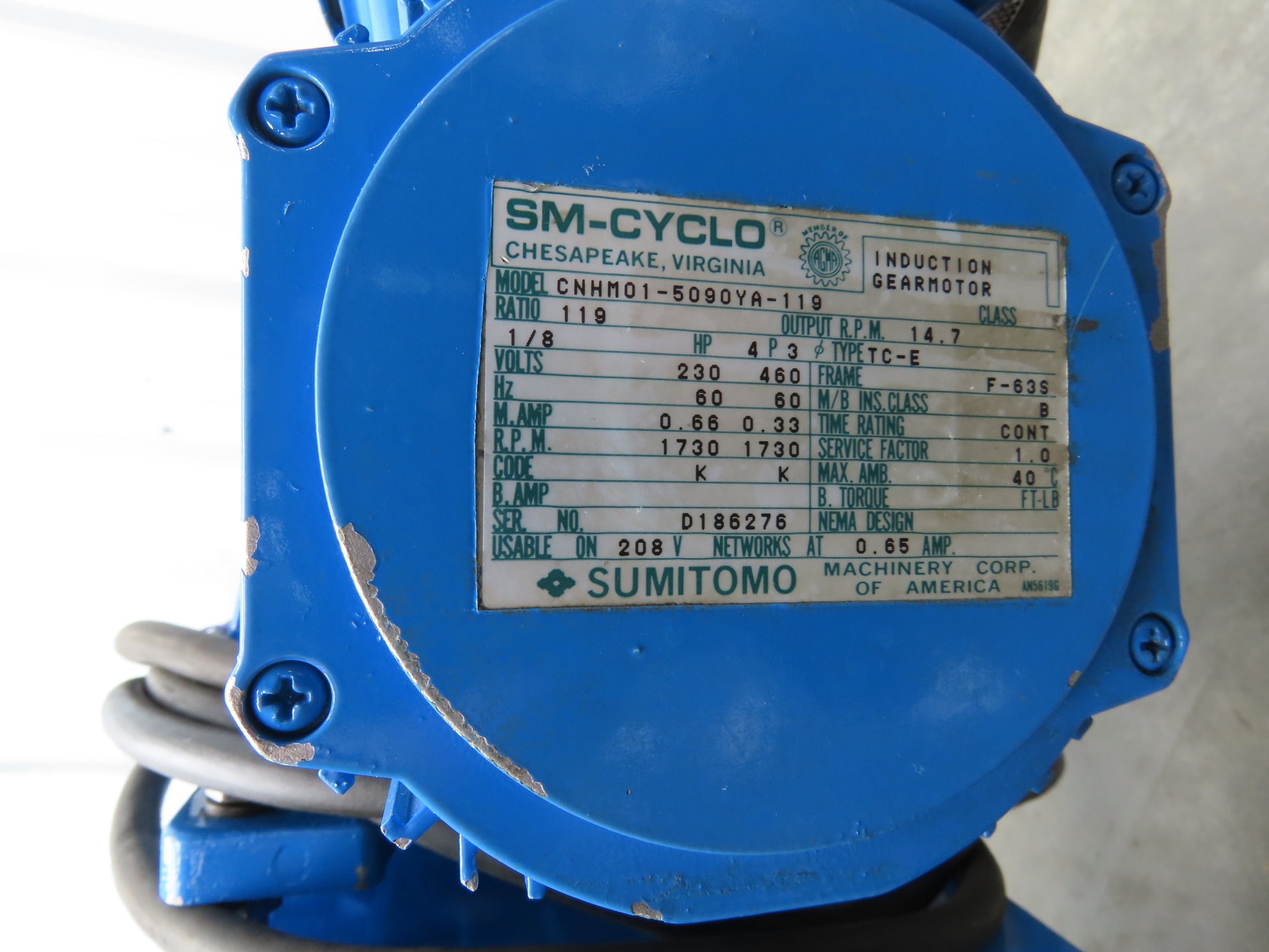 - Drive type, motor specs: Chain drive, 1/8Hp 230/460V 3PH 119:1 SM-Cyclo gearmotor.