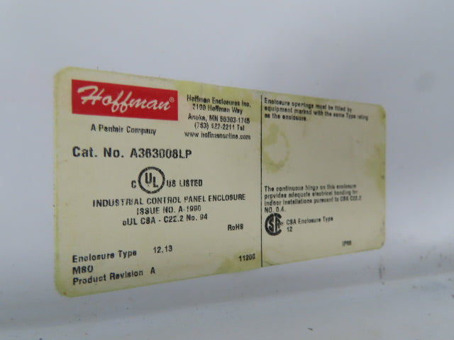 Hoffman A363008LP Wall Mount Electrical Enclosure 36x30x8" w/Backplate Type 12