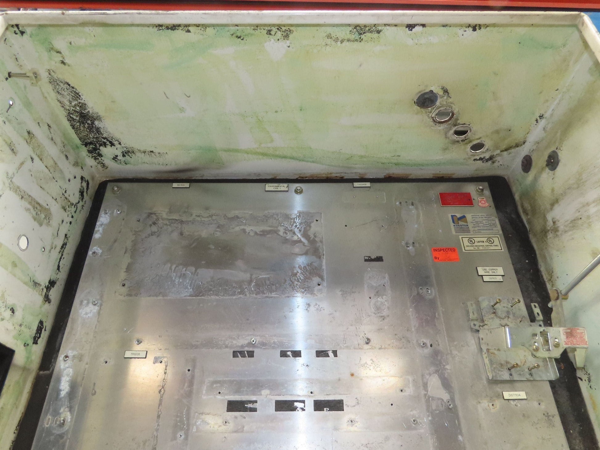 - Knockout Holes - Round: Left: 1/2". Top: 4x 3/4". Right: 3x 3/4", 1". Bottom: 2". Door: 7x 30mm, 1 unknown filled by disconnect.