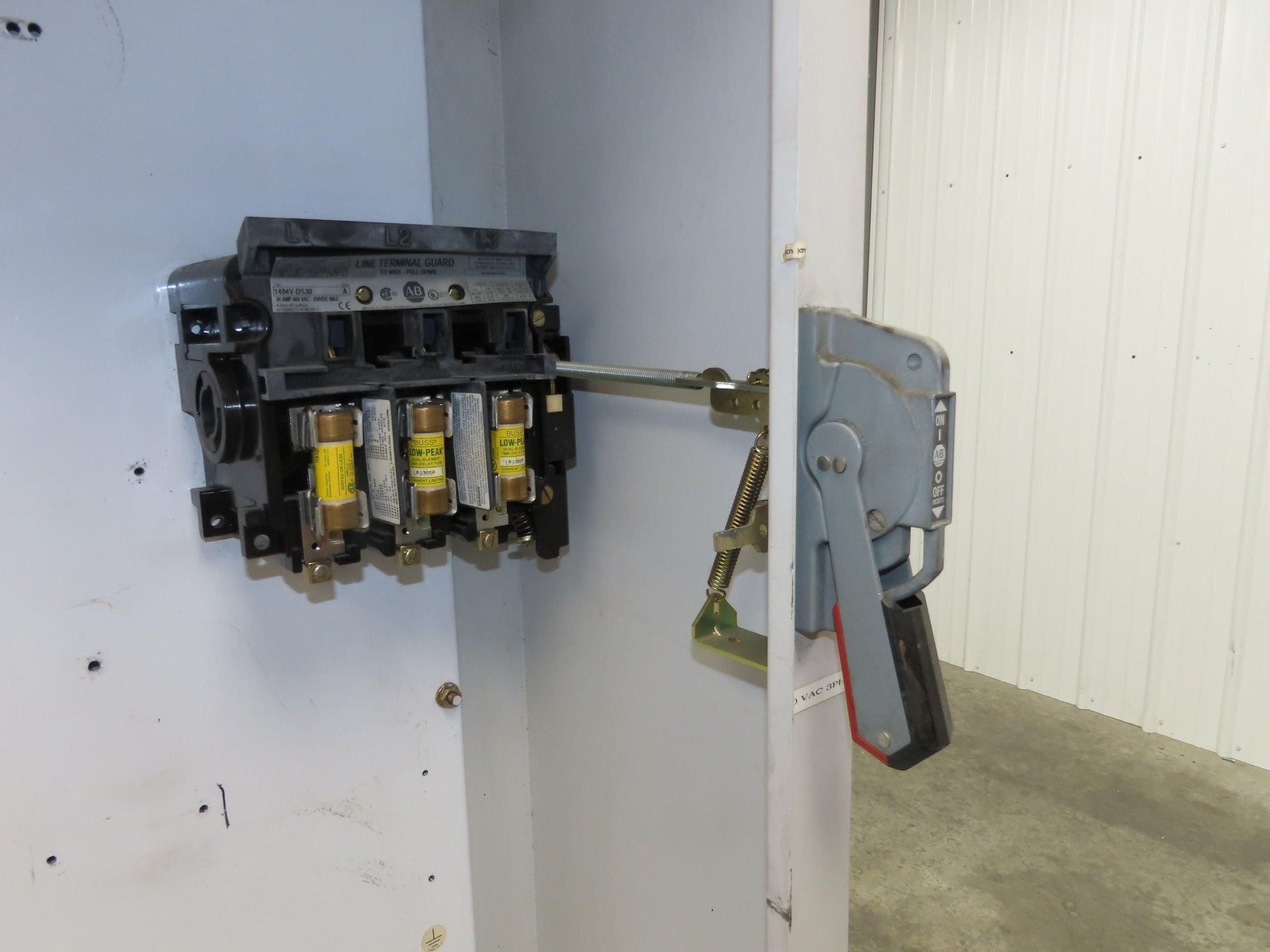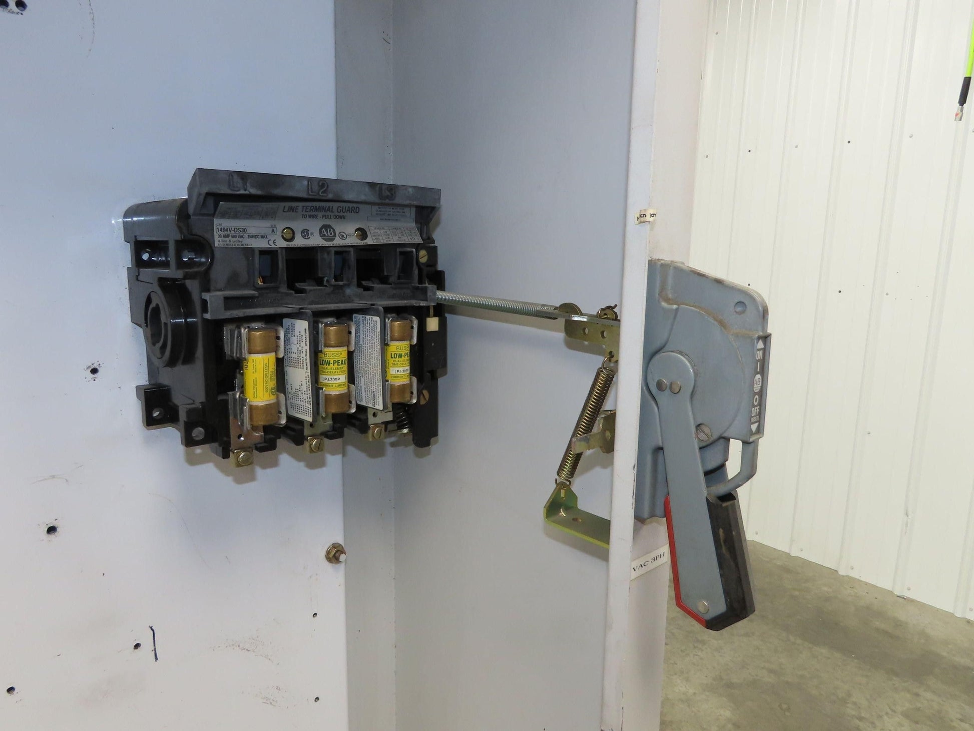 - This unit has a 30A 3 pole disconnect. Handle on the outside.