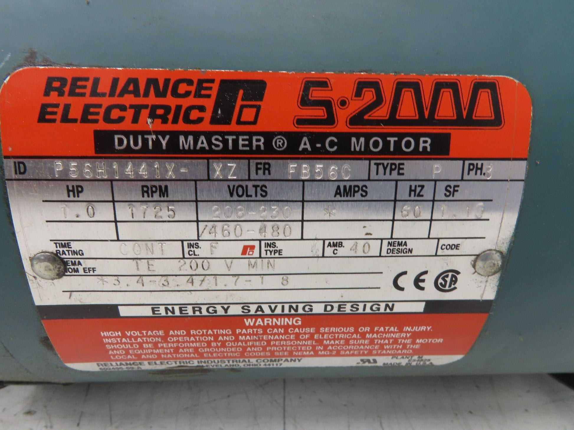 - Motor: 1Hp 1725rpm 208-230/460V 3PH 56C Reliance S-2000 P56H1441X.