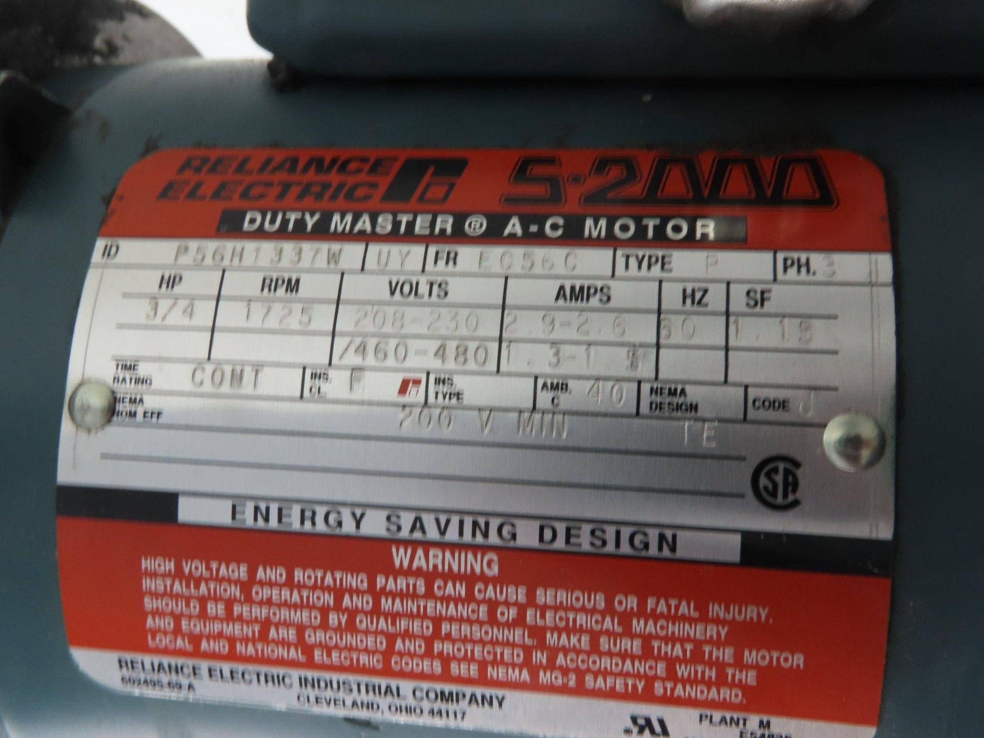 - Motor Brand and Model: Reliance S-2000