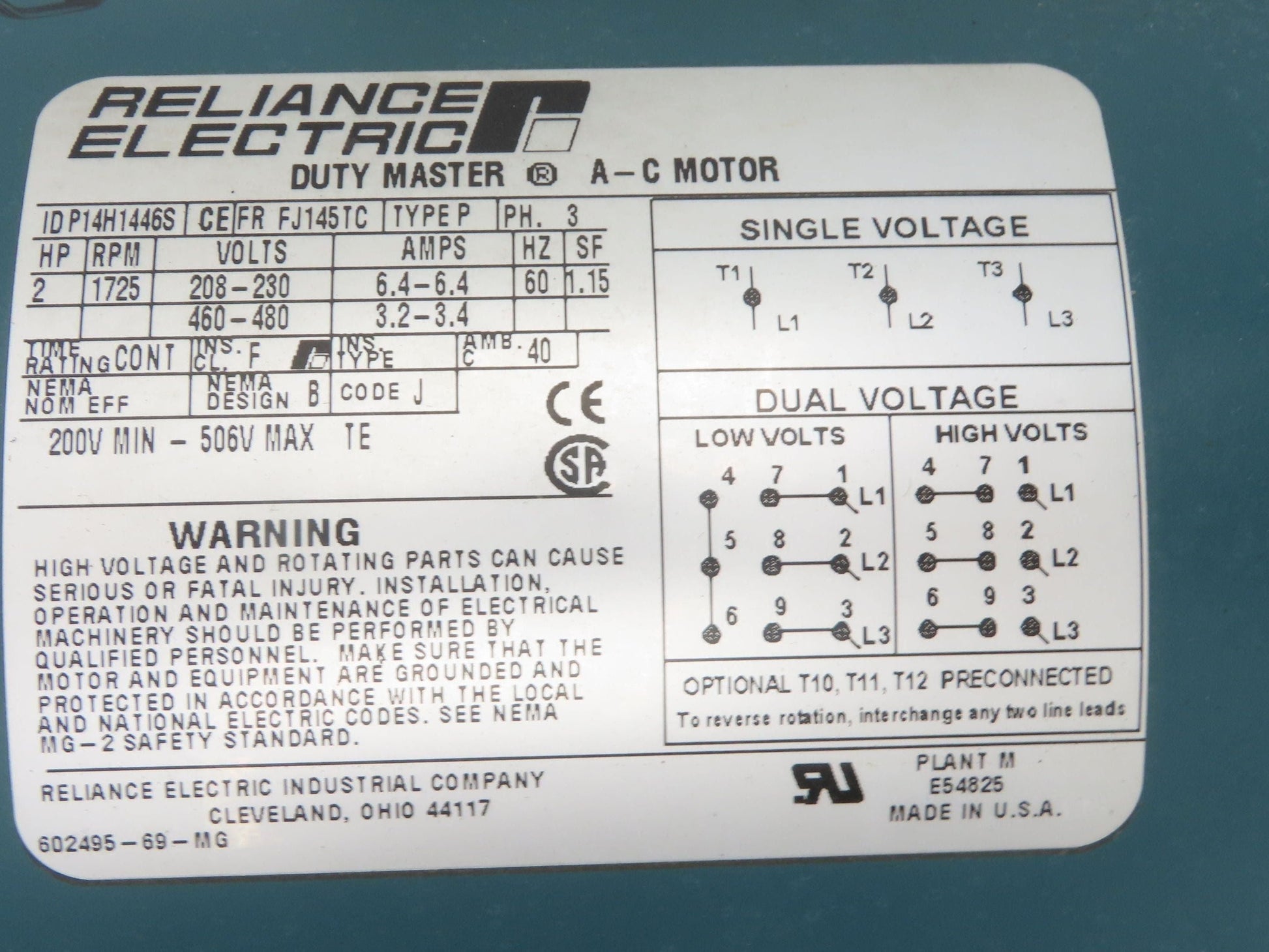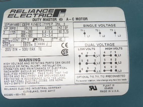 - Motor Brand and Model: Reliance P14H1446S