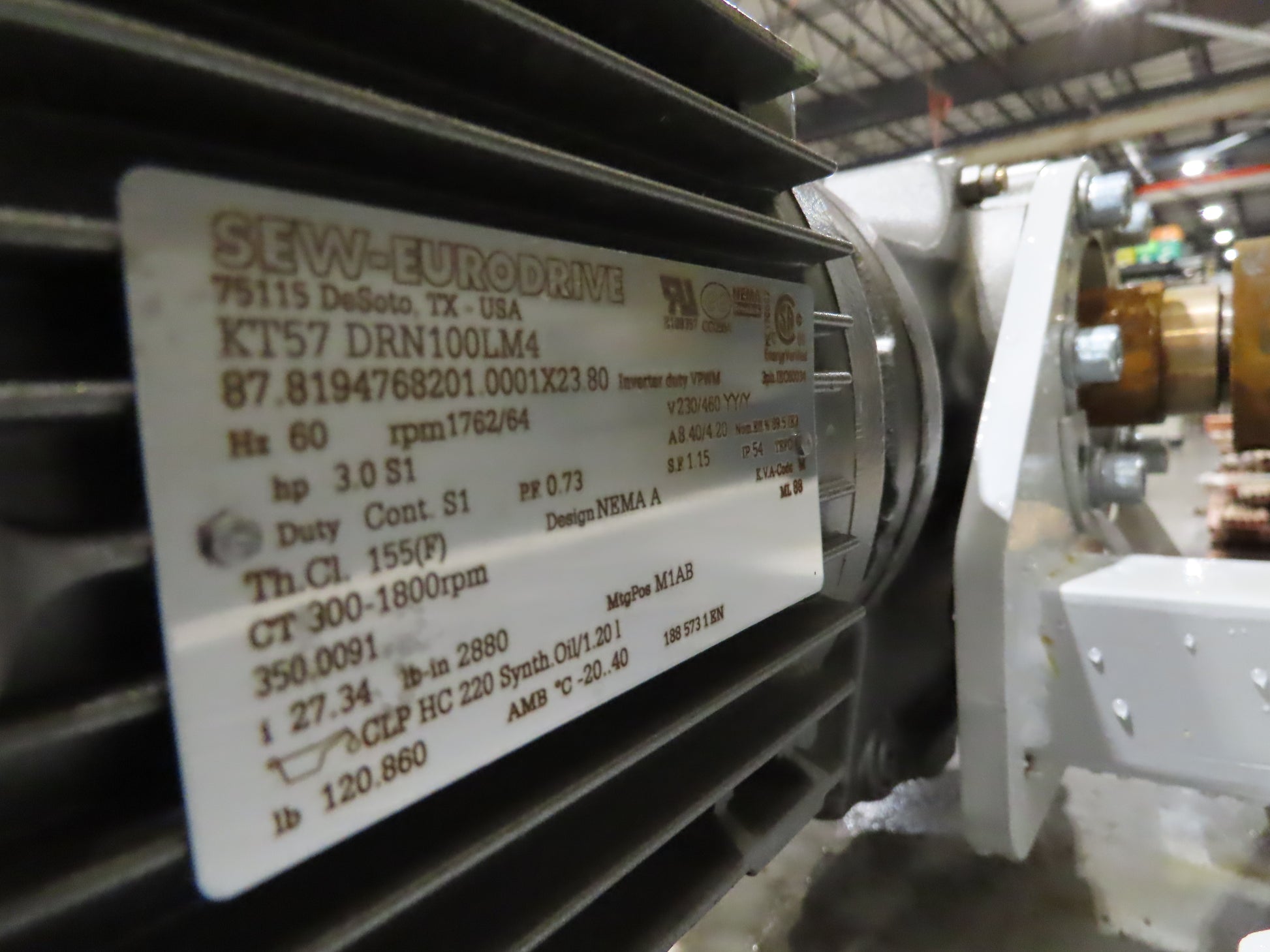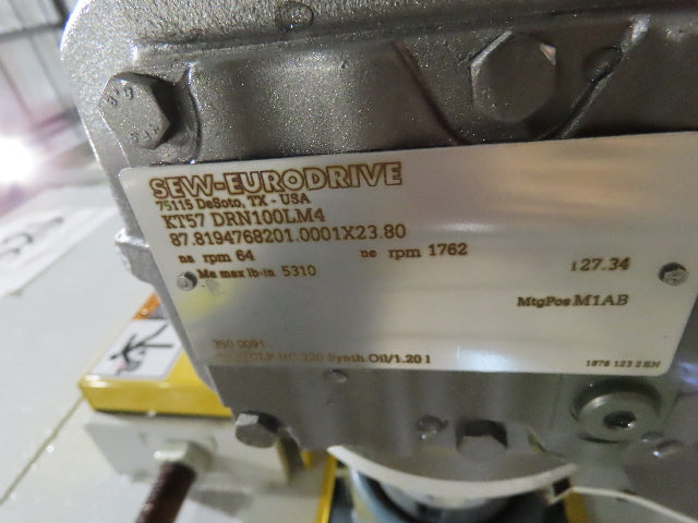 - Motor & Gearbox: Sew Eurodrive KT57 DRN100LM4 3Hp 230/460V 3PH Motor 27.34 Gearbox