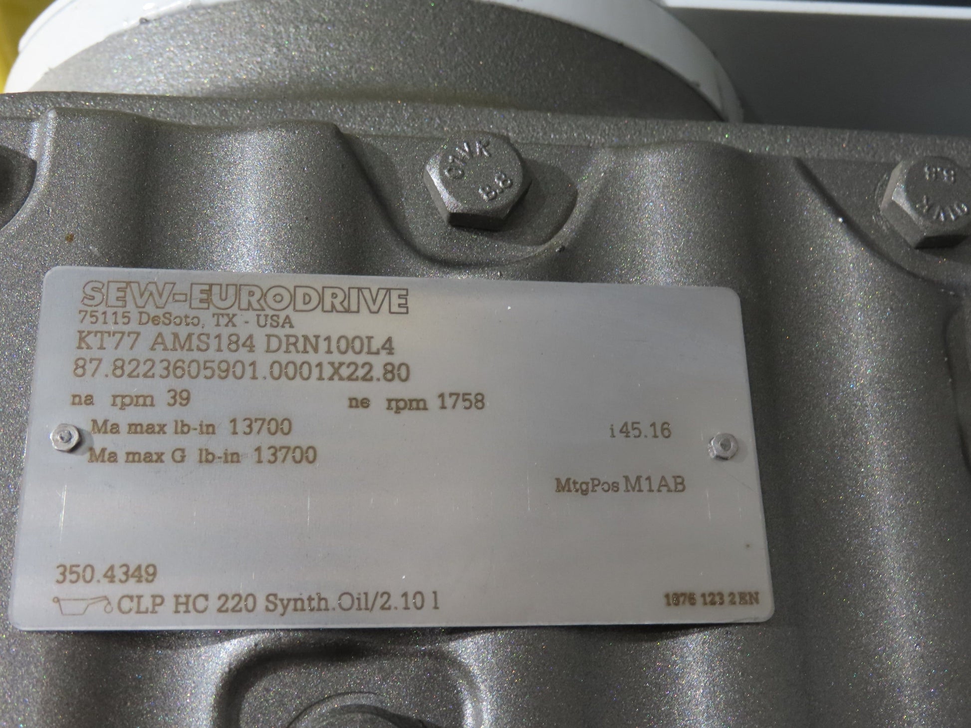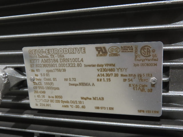 - Motor & Gearbox: Sew Eurodrive KT77 AMS184 DRN100L4 5Hp 230/460V 3PH Motor 45:1 Gearbox