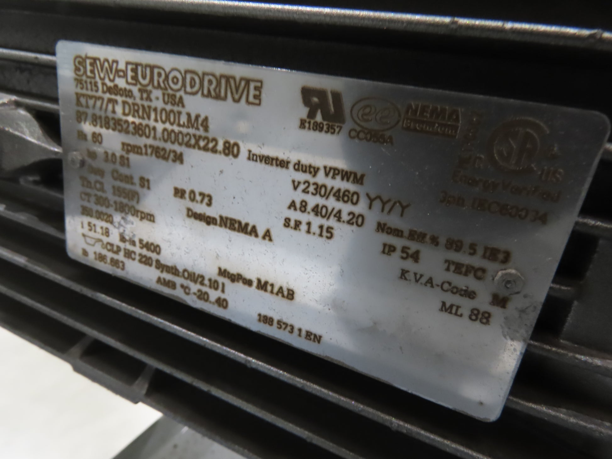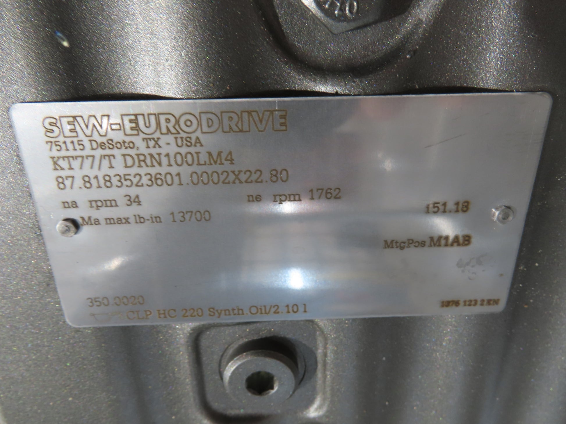 - Motor & Gearbox: Sew Eurodrive KT77/T DRN100LM4 3Hp 230/460V 3PH Motor 51.18 Gearbox