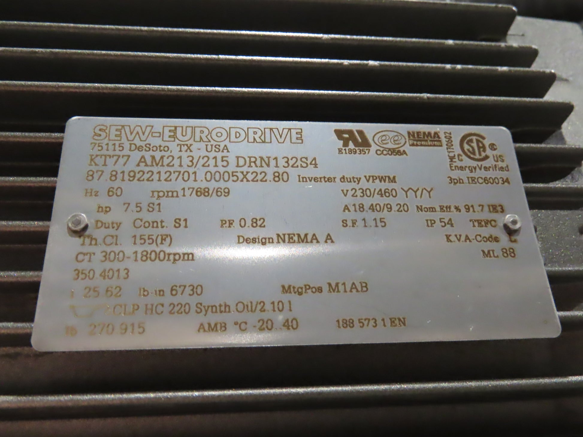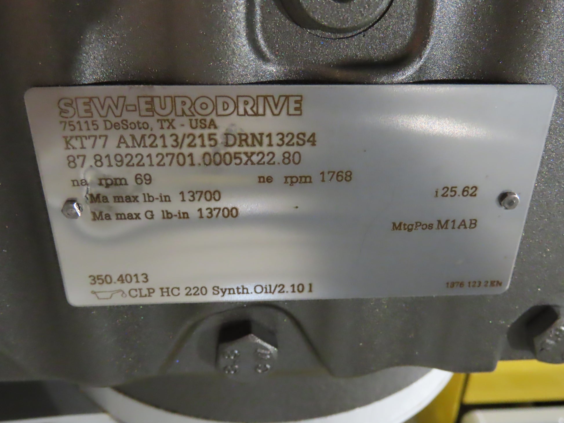 - Motor & Gearbox: Sew Eurodrive KT77 AM213/215 DRN132S4 7.5Hp 230/460V 3PH Motor 25.62 Gearbox