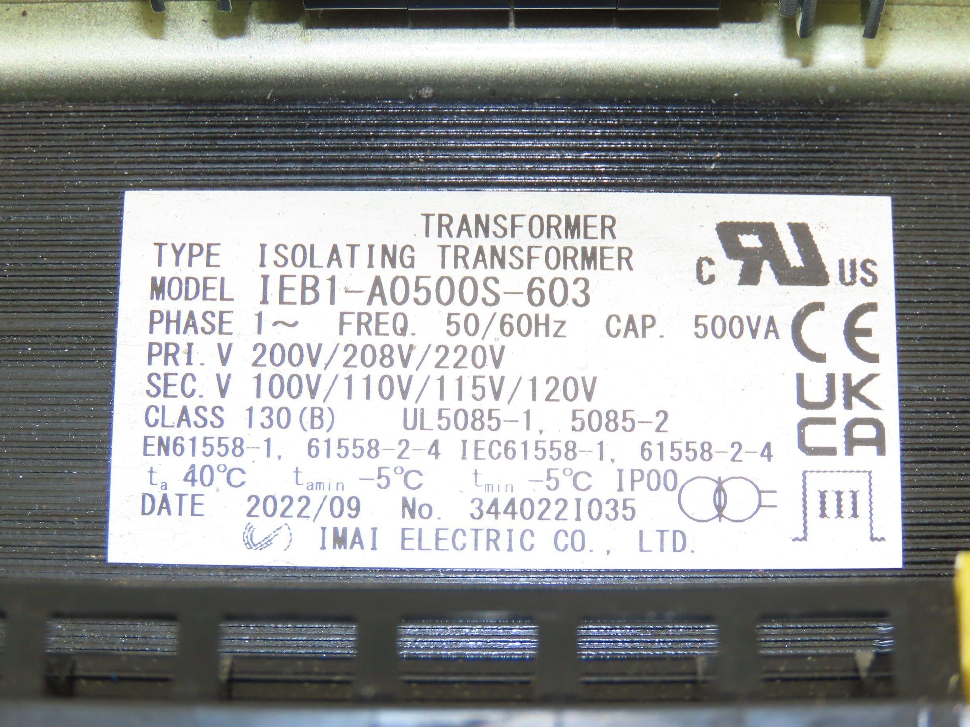 Imai IEB1-A0500S-603 Transformer 500VA 1Ph HV 200/208/220 LV 100/110/115/120