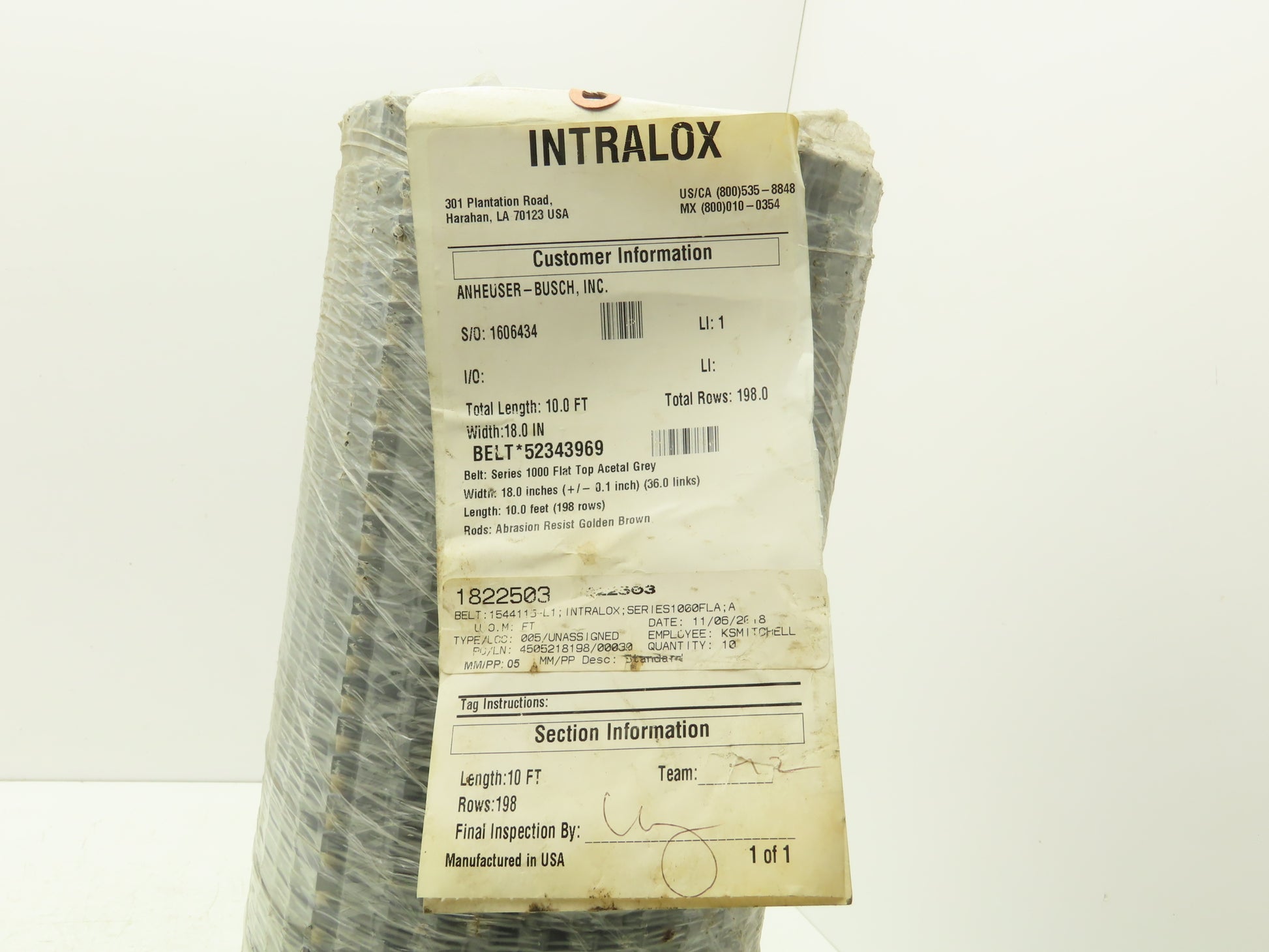 Intralox 1000 Series Flat MatTop Plastic Conveyor Belt Chain 18"W x 10'L Gray