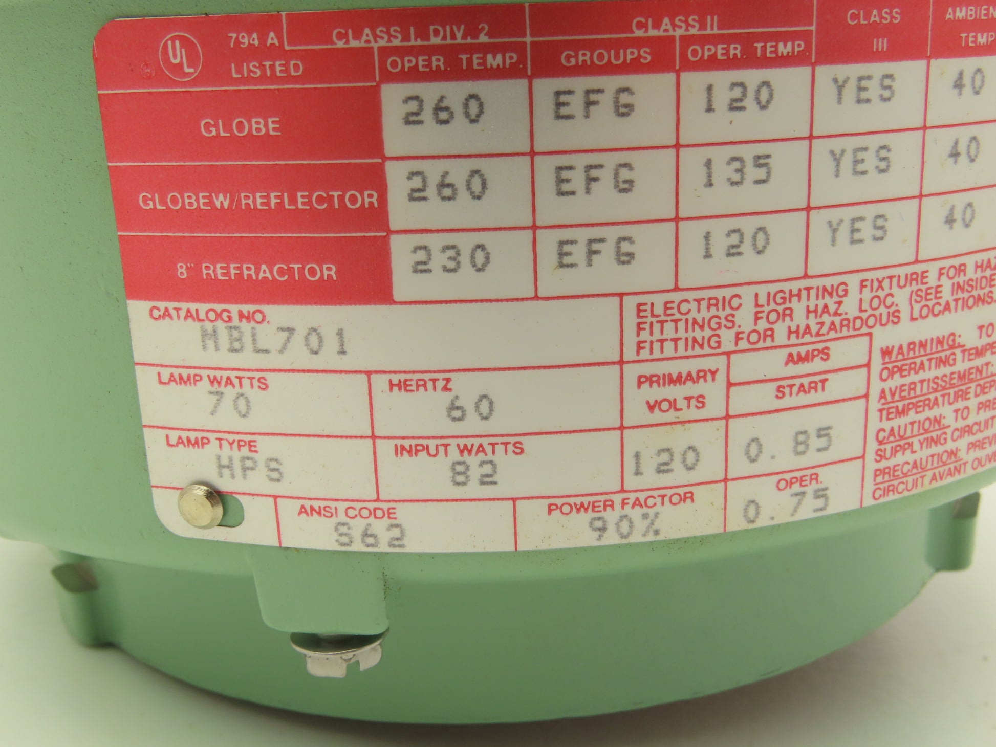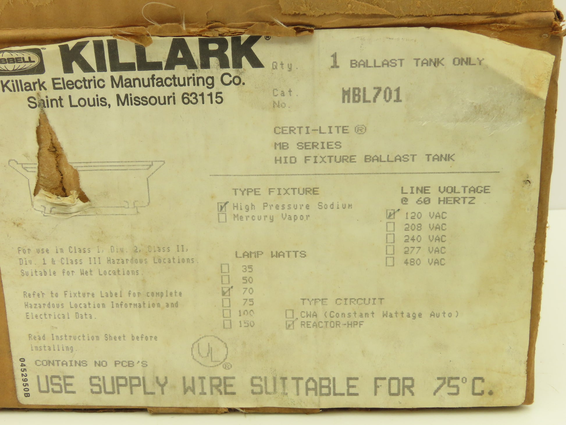 Killark MBL701 HID Fixture Ballast Tank 70W 120V 60Hz High Pressure Sodium