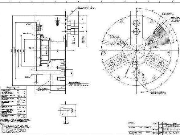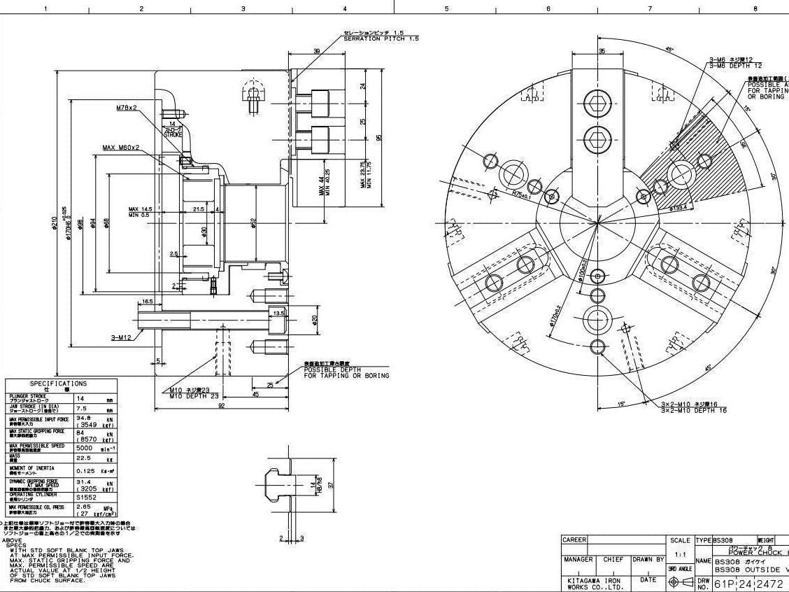 Kitagawa BS308 3-Jaw Wedge Style Power Chuck 210mm w/52mm Through-Hole 5000rpm