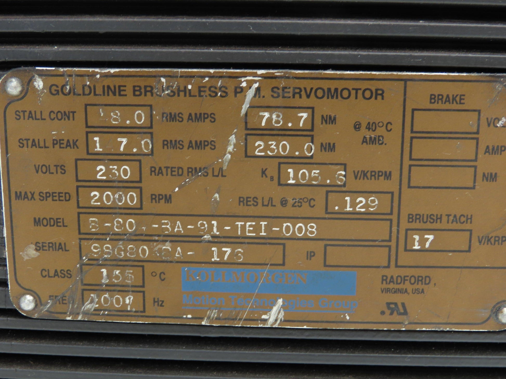 Kollmorgen B-804-BA-91-TE1-008 Goldline B Brushless Servo Motor 230V 2000 RPM