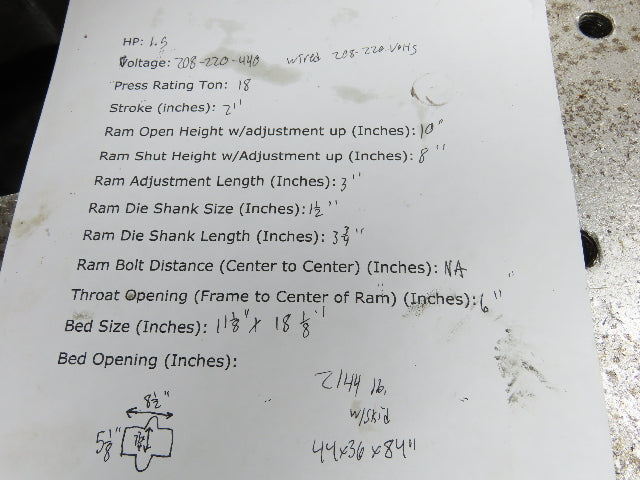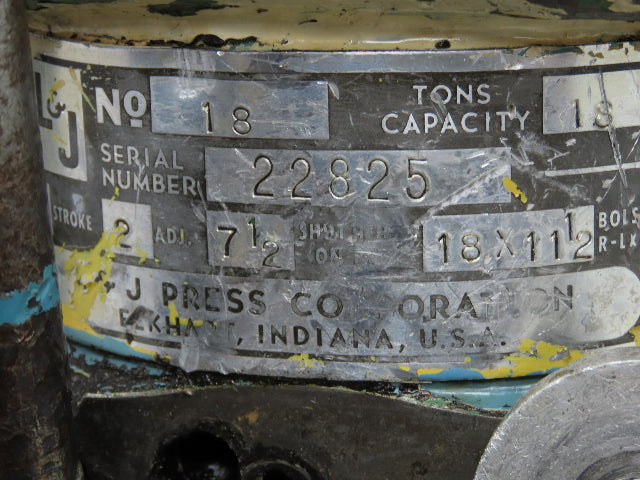 L&J No 18 Mechanical OBI Punch Press 18 Ton 2" Stroke 6" Throat 1.5Hp 3Ph