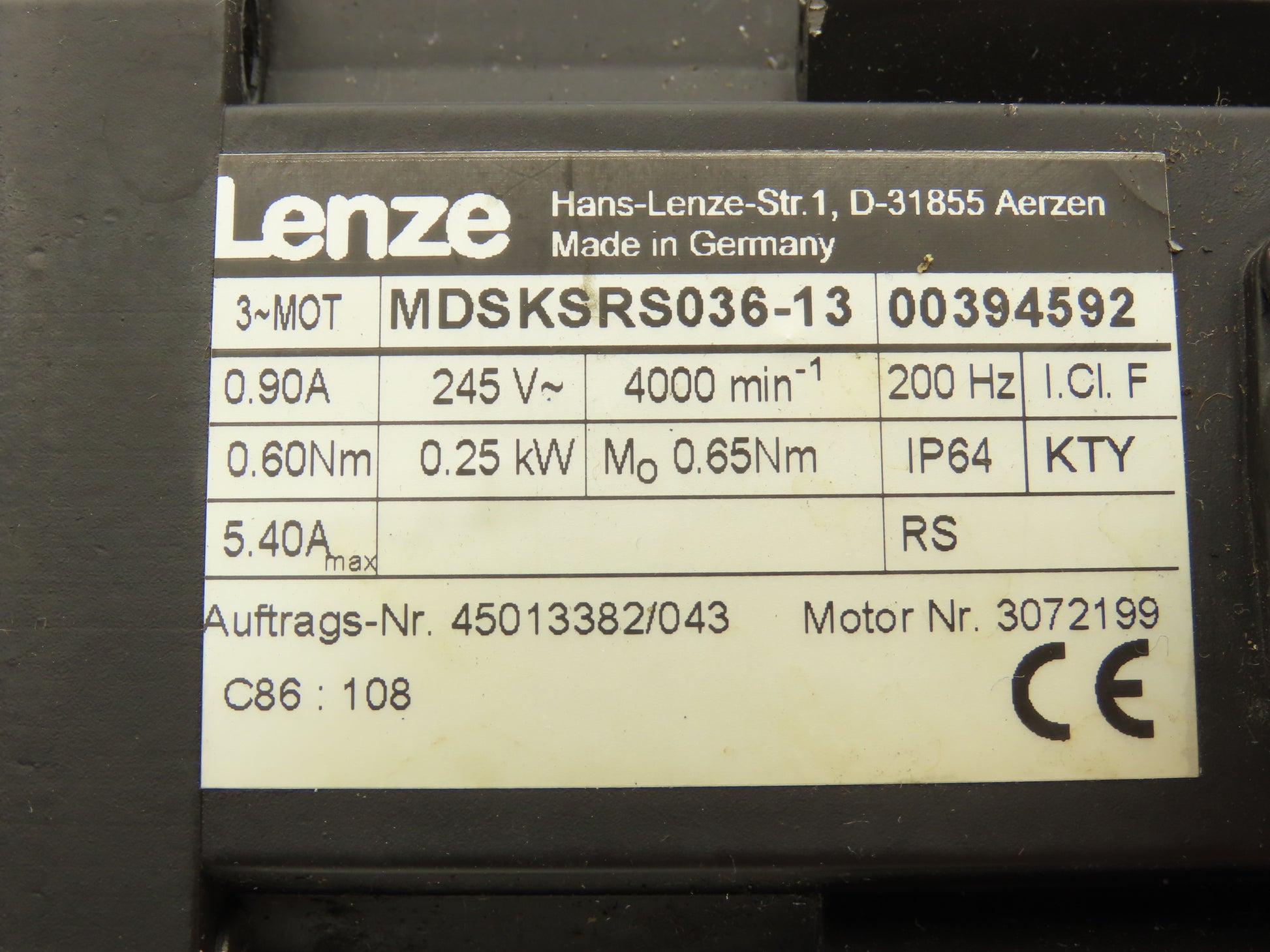 Lenze MDSKSRS036-13 Servo Motor .25kw 245V 3PH 4000 RPM 200Hz
