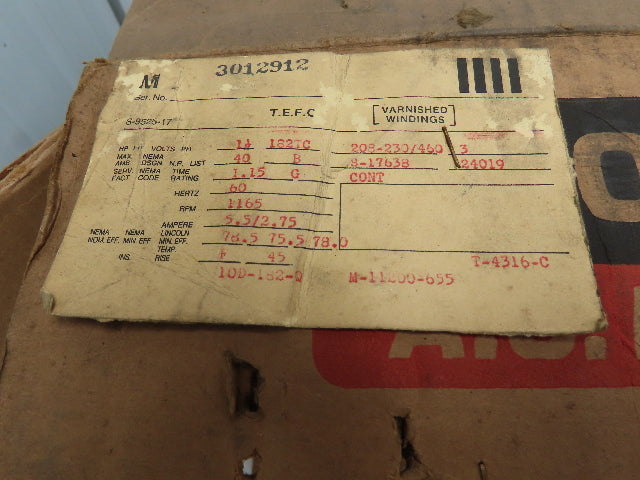 Lincoln T-4316-C 1.5 Hp 1165 Rpm 182TC Frame 208-230/460v 3 Phase Motor