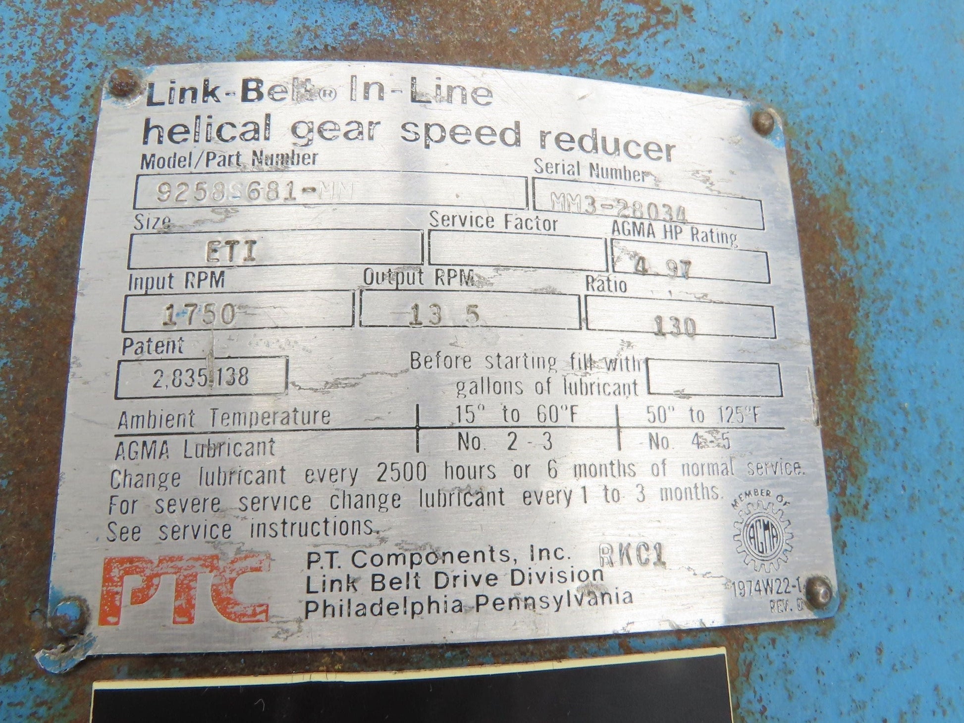 Link-Belt Inline Gearmotor 130:1 Reducer 13.5rpm 3Hp 460V 3PH Brake Motor 182TC