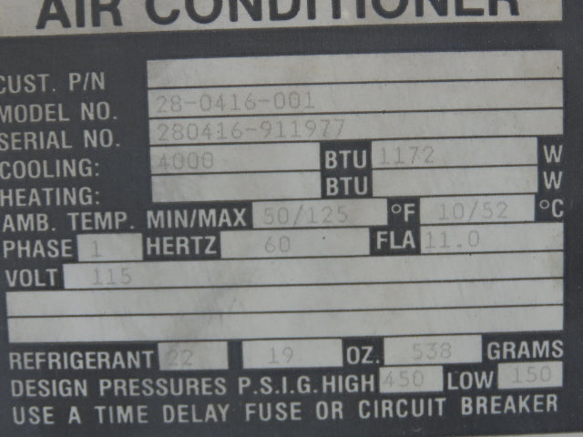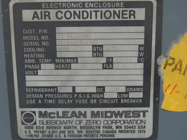 Mclean Midwest 28-0416-001 Electrical Enclosure Air Conditioner AC 4000 BTU 115V
